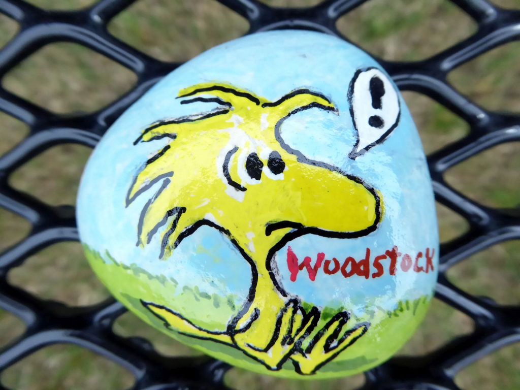 There was no way I was going to miss the opportunity to see that little bundle of yellow-feathered cuteness, so I dragged myself out of bed from my post second dose of Moderna- required nap and headed over to the bench. I was rewarded with the sight of one of my favorite Peanuts Gang characters, Woodstock! Poor thing; he was looking so confused on his painted rock. I wonder what he saw that perplexed him so…