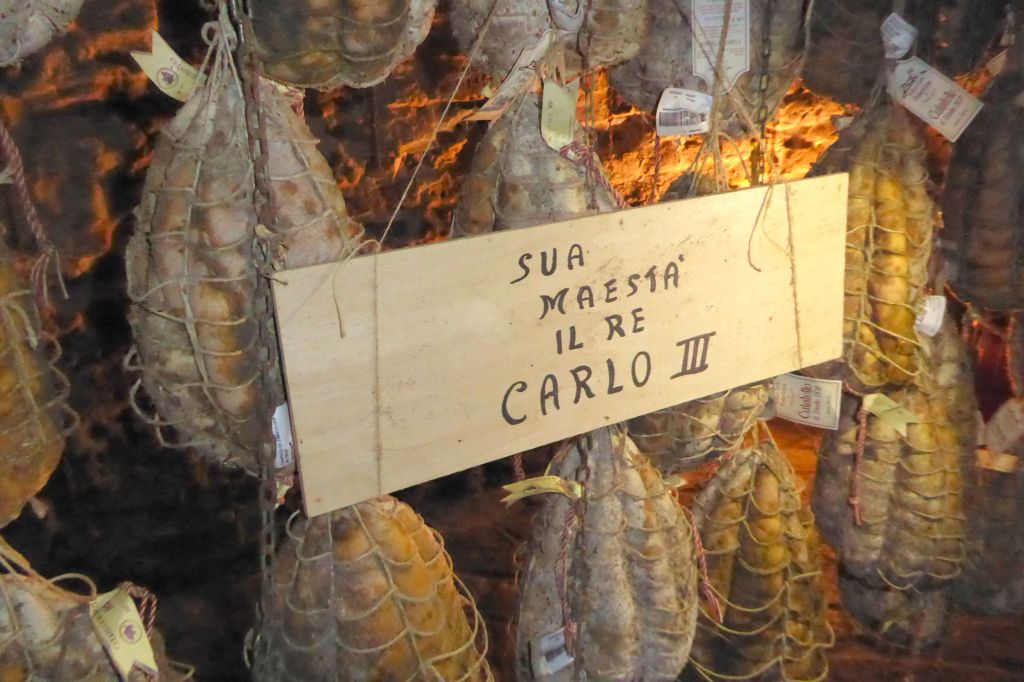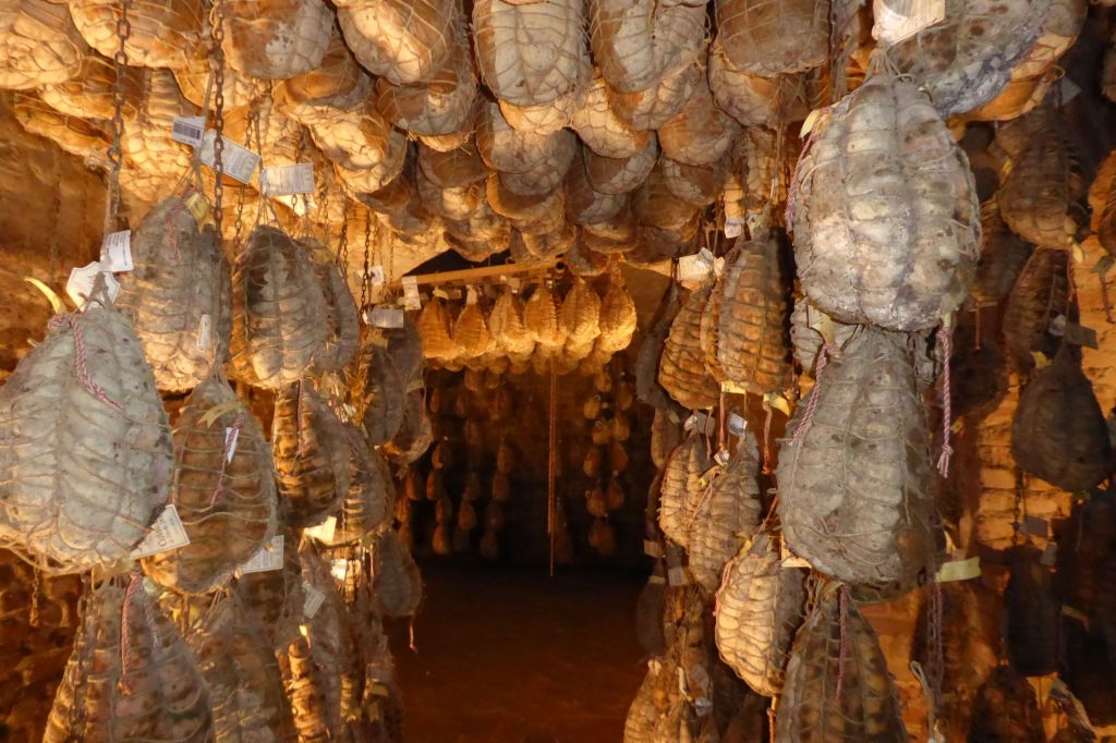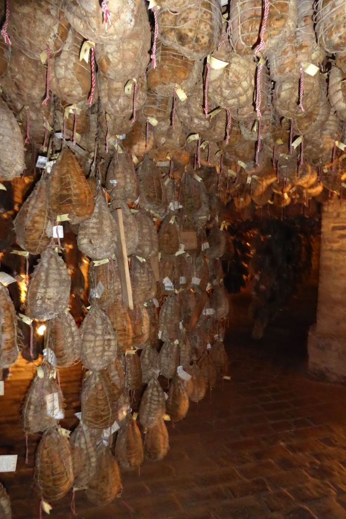 Stepping down into the ancient cellar, taking in the aroma, and seeing strung hams hanging everywhere I turned was surreal! These are not some ordinary hams; they are in demand by famous chefs and dignitaries all over the world. Some of these hams were even reserved for King Charles III!