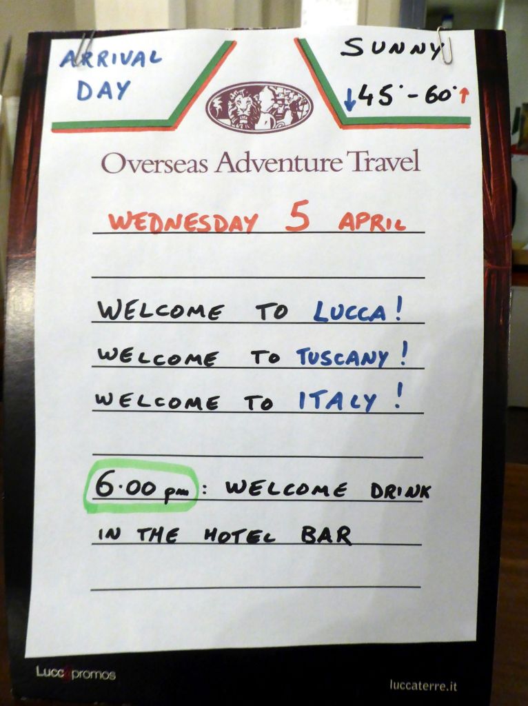 For the six of us who traveled the past several days with Oscar as our Overseas Adventure Travel (OAT) tour leader, our arrival to Lucca marked the end of the pre-extension tour and the beginning of the base trip, Tuscany & Umbria: Rustic Beauty in the Italian Heartland. Bruce and I had enjoyed our time with Oscar very much, so we didn’t want to say goodbye. He assured us that our new tour leader, Ben, was the best, and we would like him. After all, he had been trained by Ben, the senior tour leader for OAT in Italy.
