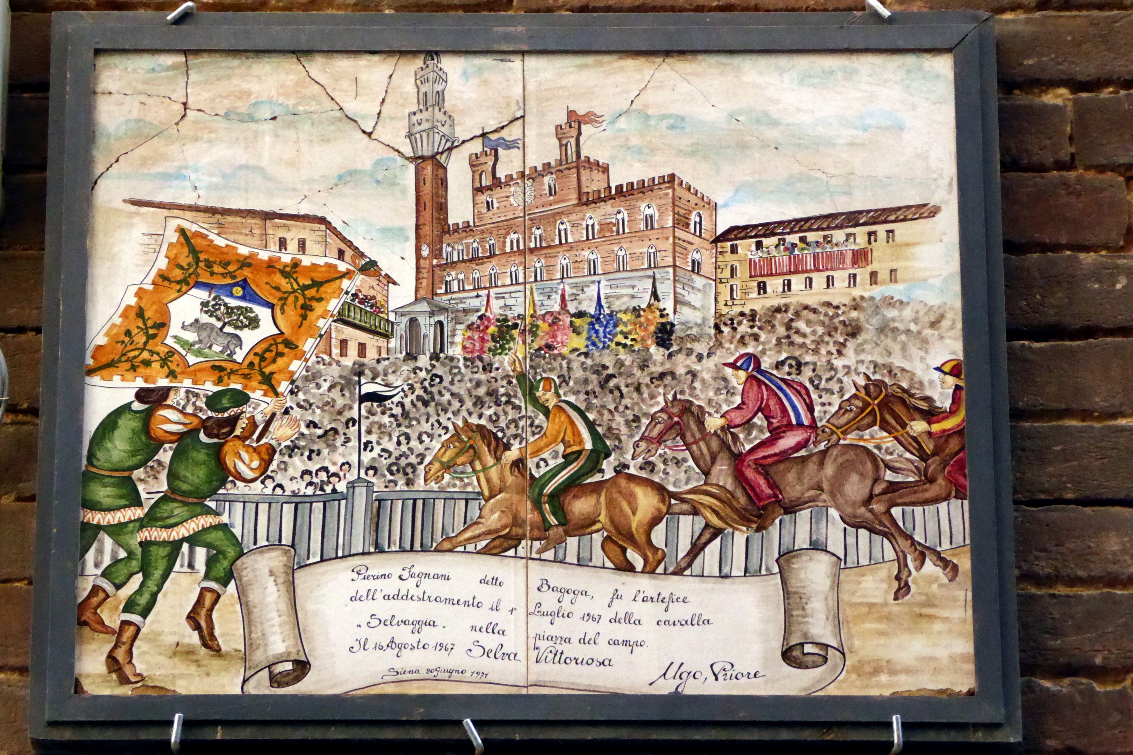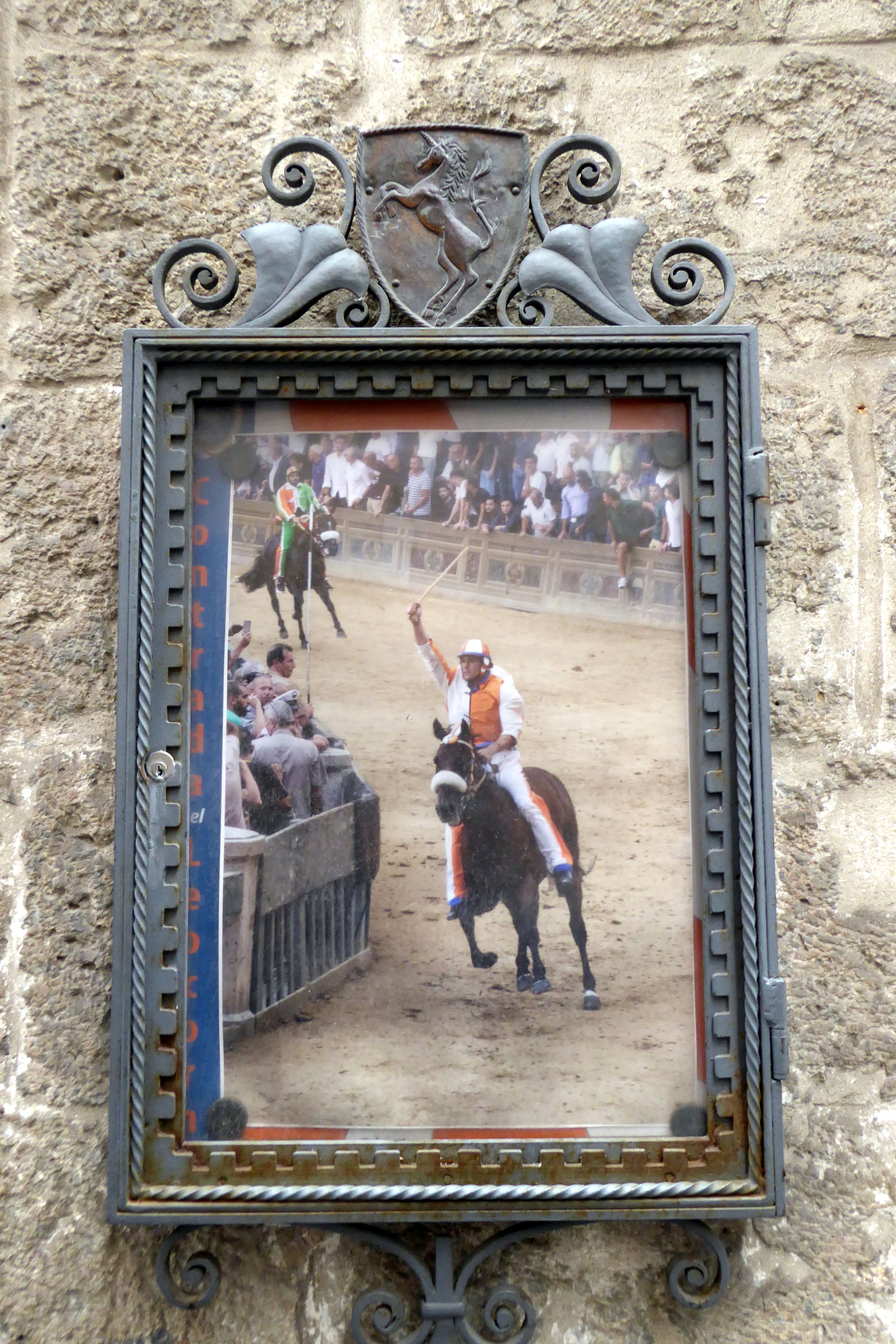 These contrade were originally set up during the Middle Ages for military purposes when Siena fought to preserve its independence from Florence. Over the years, they became a source of civic pride and patriotism. Within the contrada, everybody looks out for each other as an extended family. Each contrada has their own symbol, colors, flags, motto, museum, church, fountain, and festivals; and, most importantly, a horse entered in the all-important and most-celebrated festival of all, the Palio. These people live for the summer Palio, an approximately 70-90-second bareback horse race of three laps of mayhem around the dirt-filled Piazza del Campo that takes place on July 2 and August 16. The turns are sharp, and it’s typical to see jockeys thrown off their horses. No worries; it’s the horse that wins, not the jockey, and riderless horses have won on several occasions.