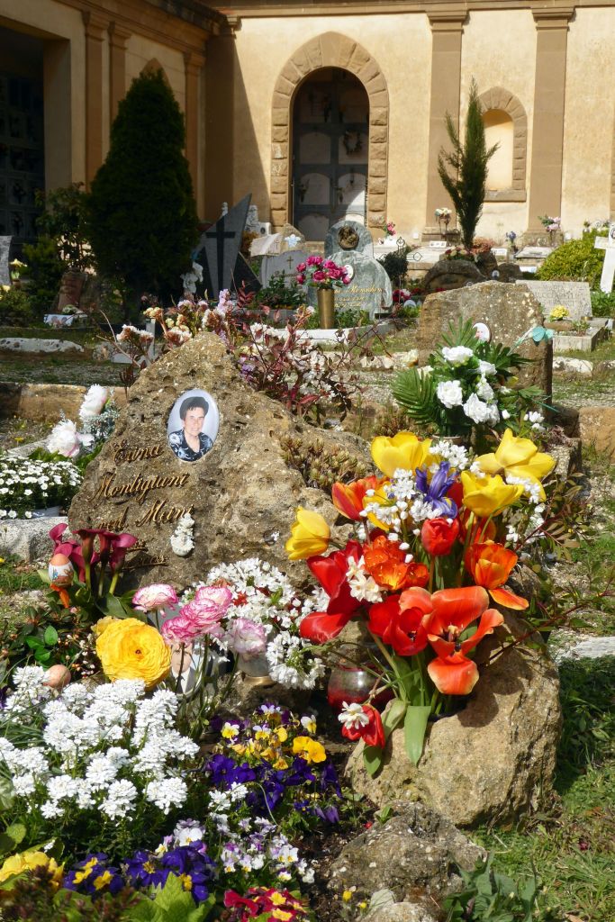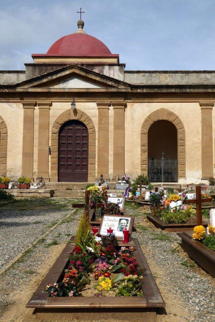 Several of us joined Ben on an optional walk after we returned from Montepulciano. The path we took bordered the town on the edge of the hill overlooking Val D’Orcia. The views were spectacular, and we came across an interesting cemetery along the way. I was intrigued by the effort loved ones made to keep each plot well-maintained and full of beautiful potted or planted flowers.