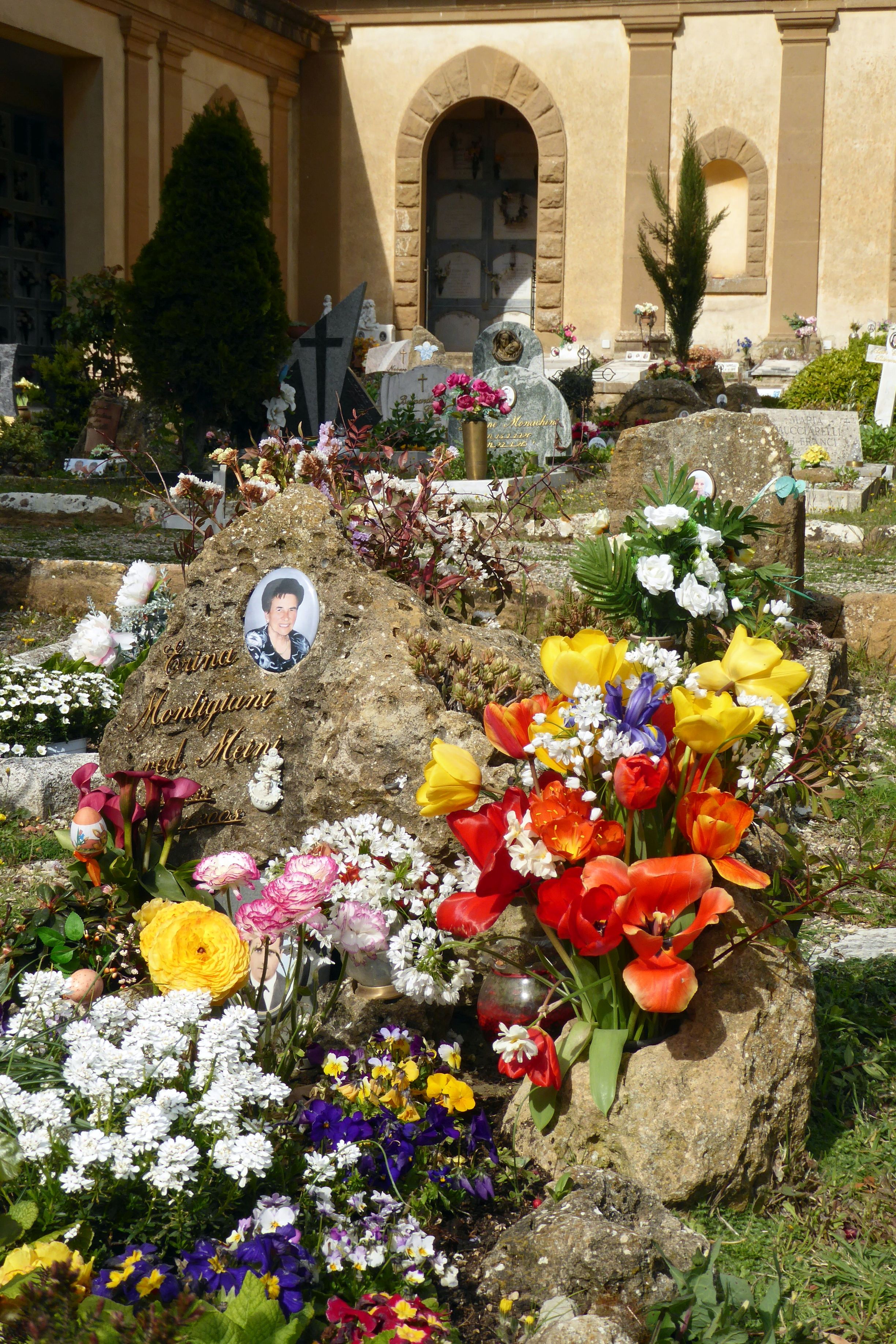 Several of us joined Ben on an optional walk after we returned from Montepulciano. The path we took bordered the town on the edge of the hill overlooking Val D’Orcia. The views were spectacular, and we came across an interesting cemetery along the way. I was intrigued by the effort loved ones made to keep each plot well-maintained and full of beautiful potted or planted flowers.