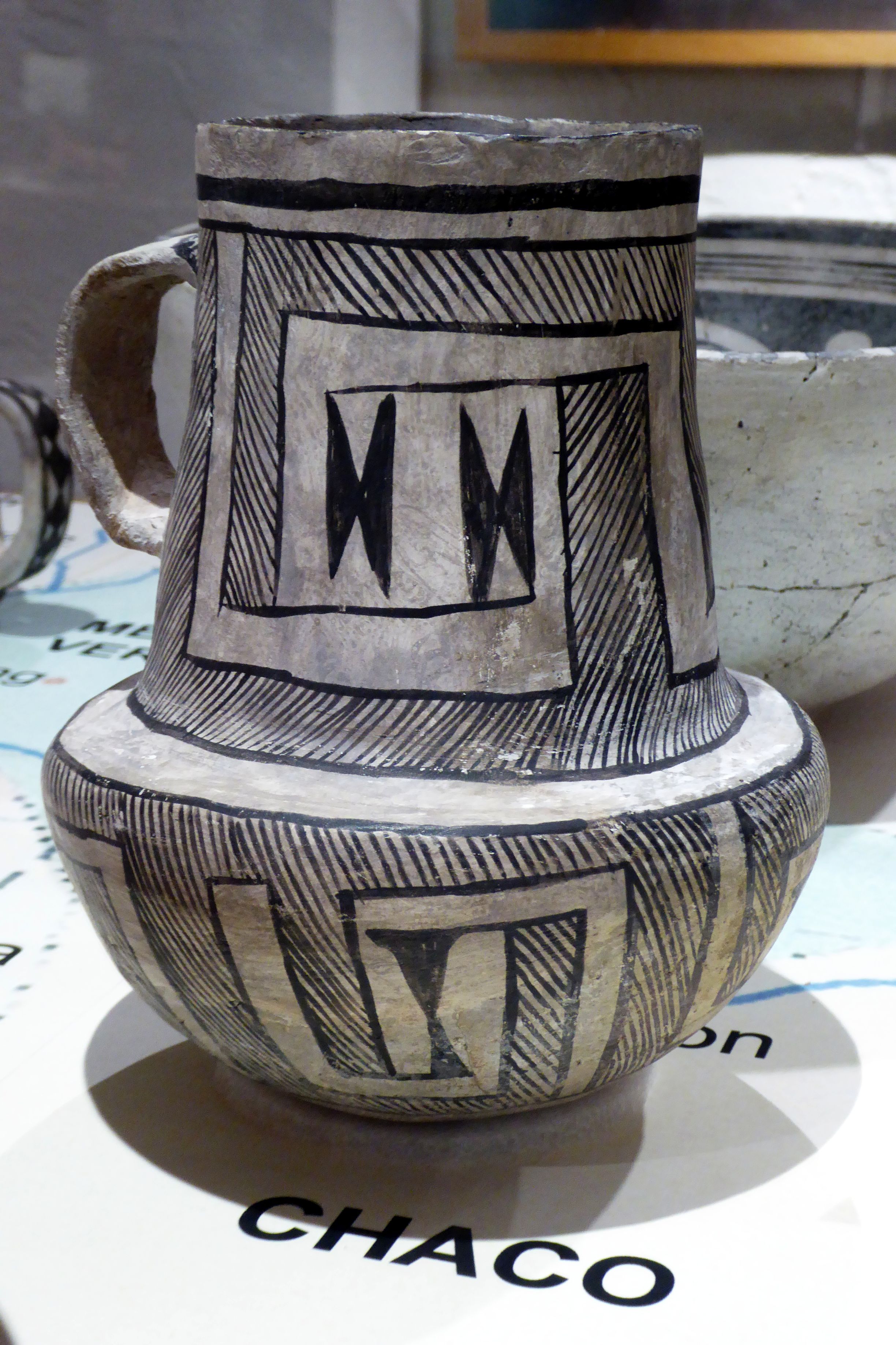 Chaco ceramics are also black-on-white. Their most distinctive style involved bounded fields filled with hachured or parallel lines. Geometric scrolls are common motifs, and curvilinear designs also occur. Cylindrical vases and cylindrical-necked pitchers are unique to the Chacoan style and may have been produced by specialists.