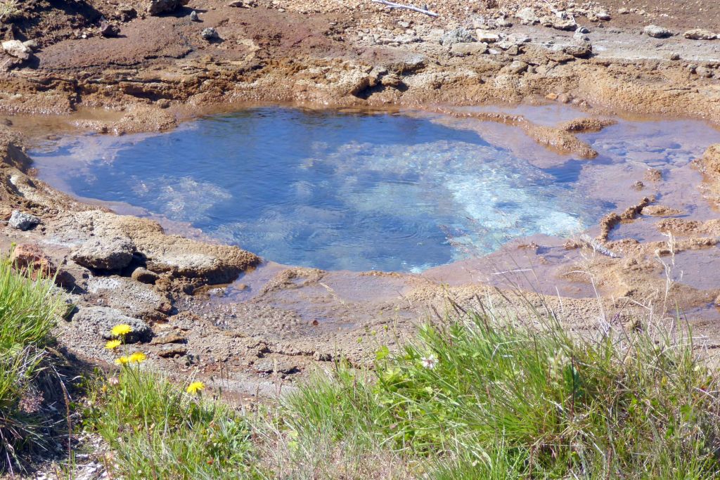 Geysir was a fun and fascinating stop for us. The main draw was the geyser that periodically spouted boiling water a couple of hundred feet up into the air. I watched it 14 times, and Bruce witnessed 16 spouts. (I was hiking up the hill to get a birds-eye view and missed a couple.)