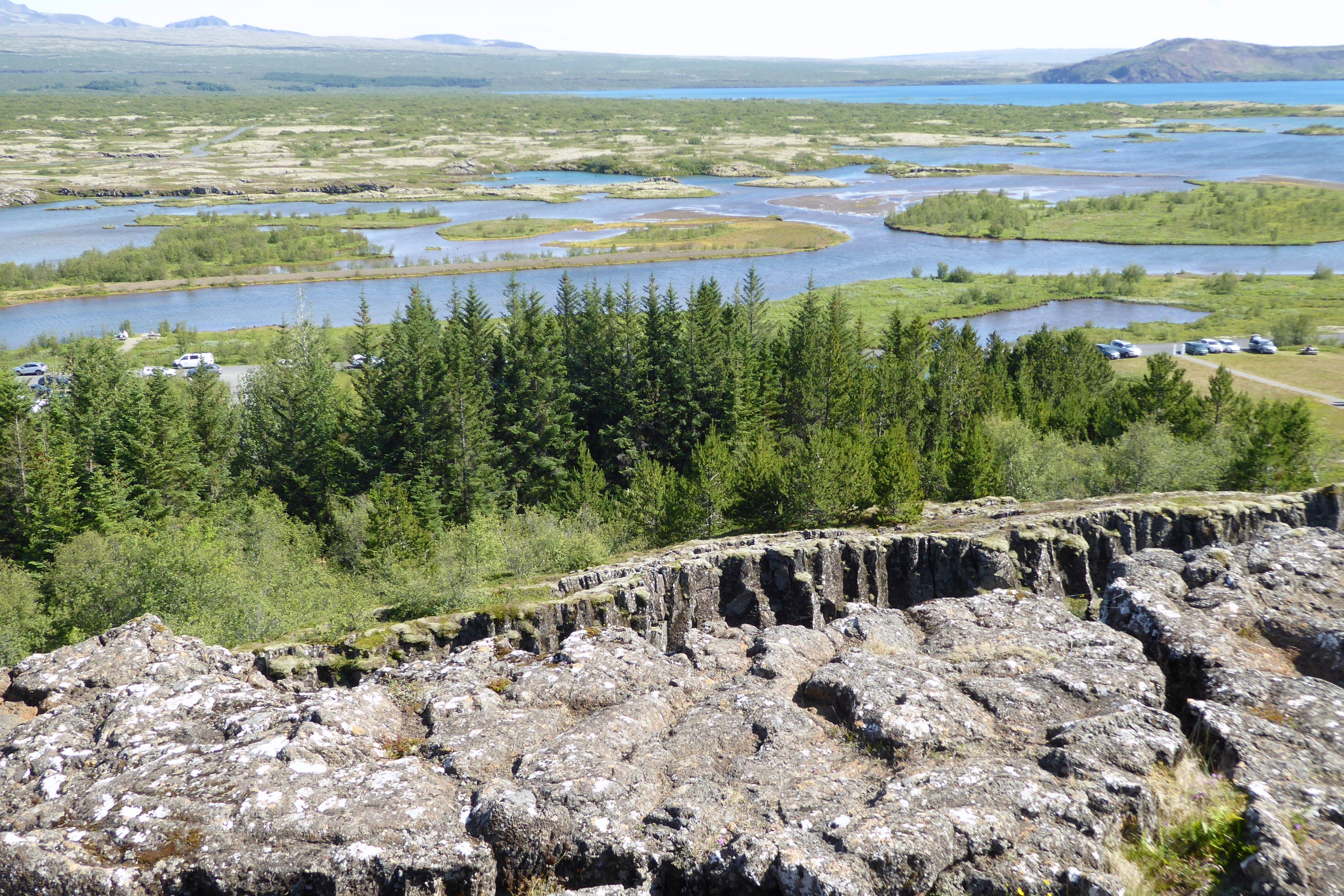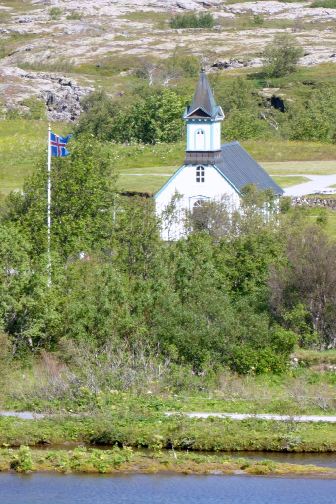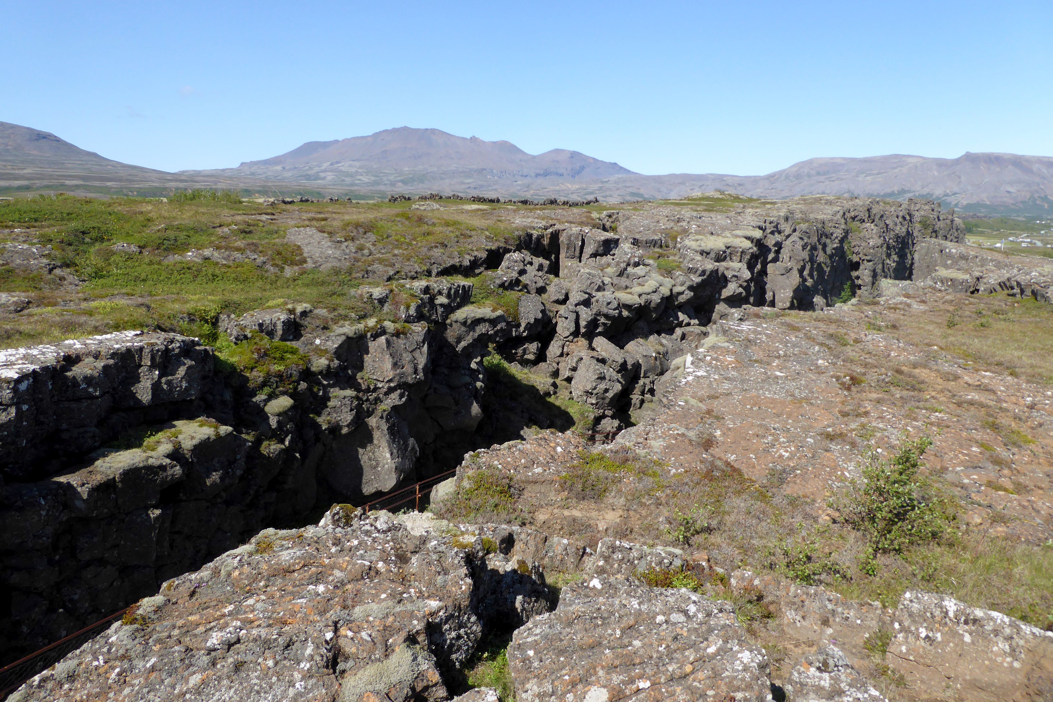 Wow, I sure digressed! Where was I? Oh! Back to the Golden Circle! Next stop: Thingvellir National Park. (That’s how it is spelled in English. Check out the link to see the Icelandic character for “Th.”) A UNESCO World Heritage Site, it has an interesting history. This Wikipedia article gets into much more detail, but suffice it to say the park is a site of historical, cultural, and geological significance. It is also one of the most popular tourist destinations in Iceland. The biggest draw is that you can see the continental drift between the North American and Eurasian Plates. It’s not just the visible cracks (faults); there is a canyon clearly demonstrating the existence of plate tectonics. It was an appropriate location for the world’s oldest Parliament, assembled in 930.
