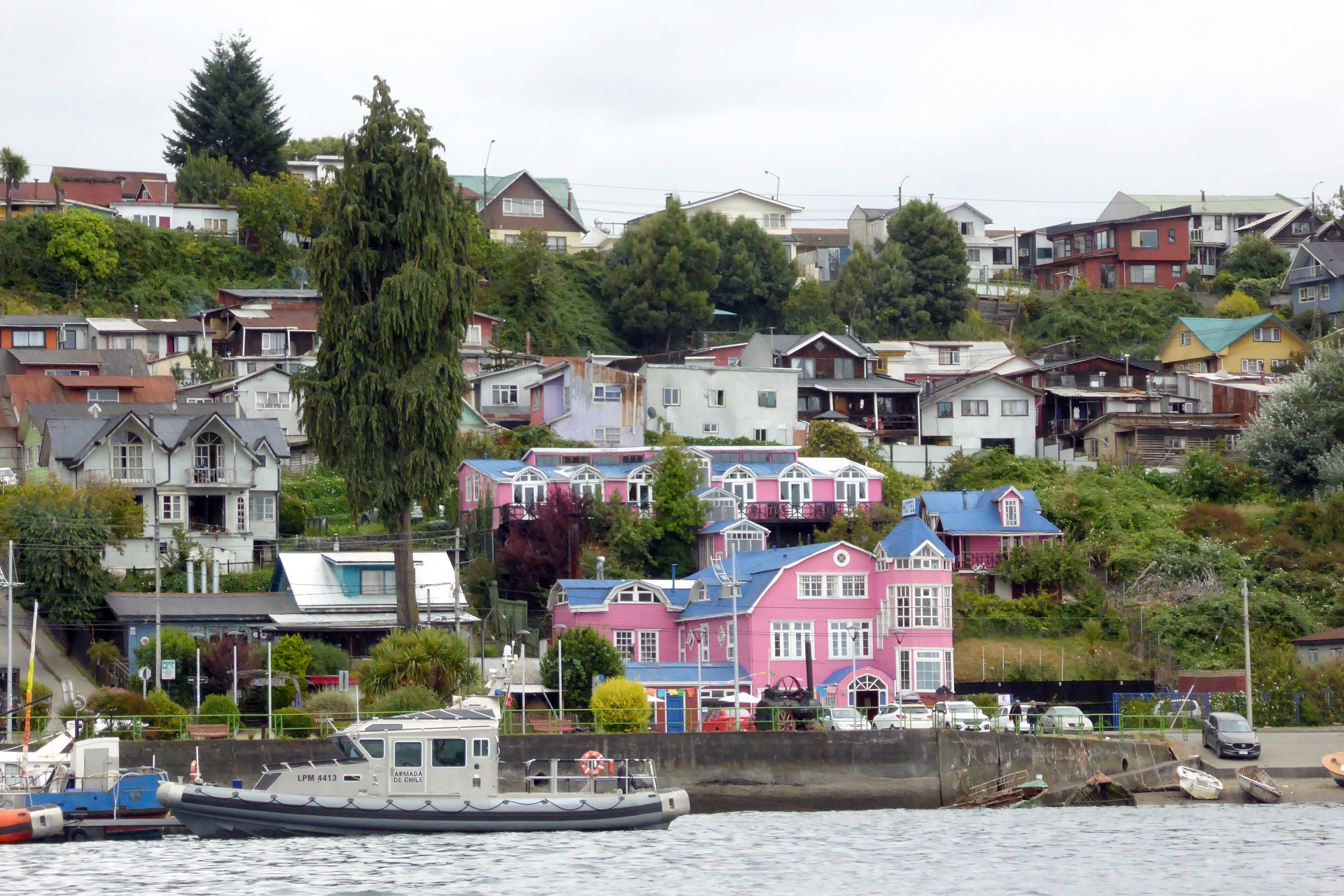 While the others went inside to explore the church further, I hoofed it up the hill to take a closer look at houses I had seen on the bus ride to the square. I had been captivated by the artistically cut house shingles since arriving on Chiloe Island, and I wanted to see more.