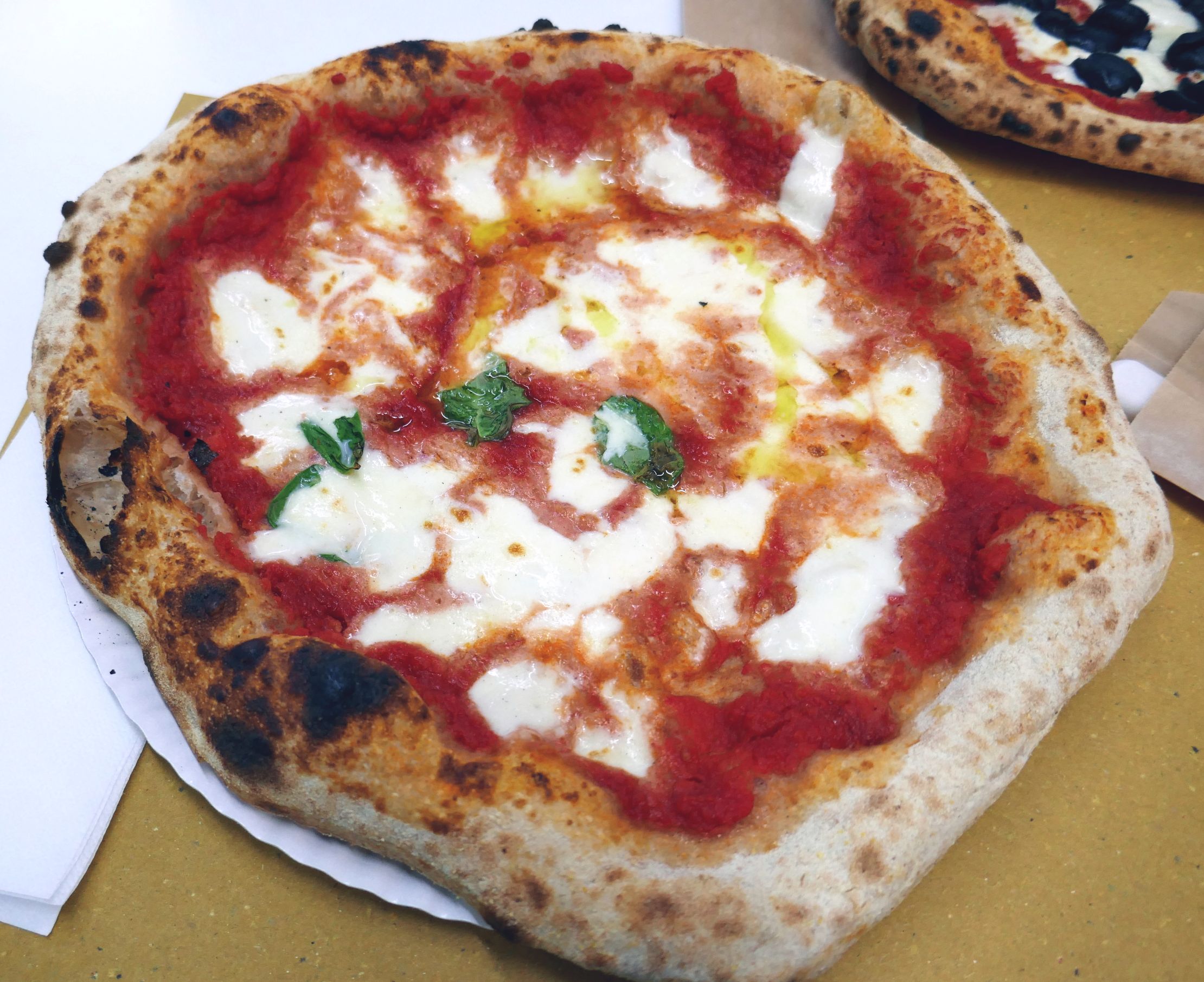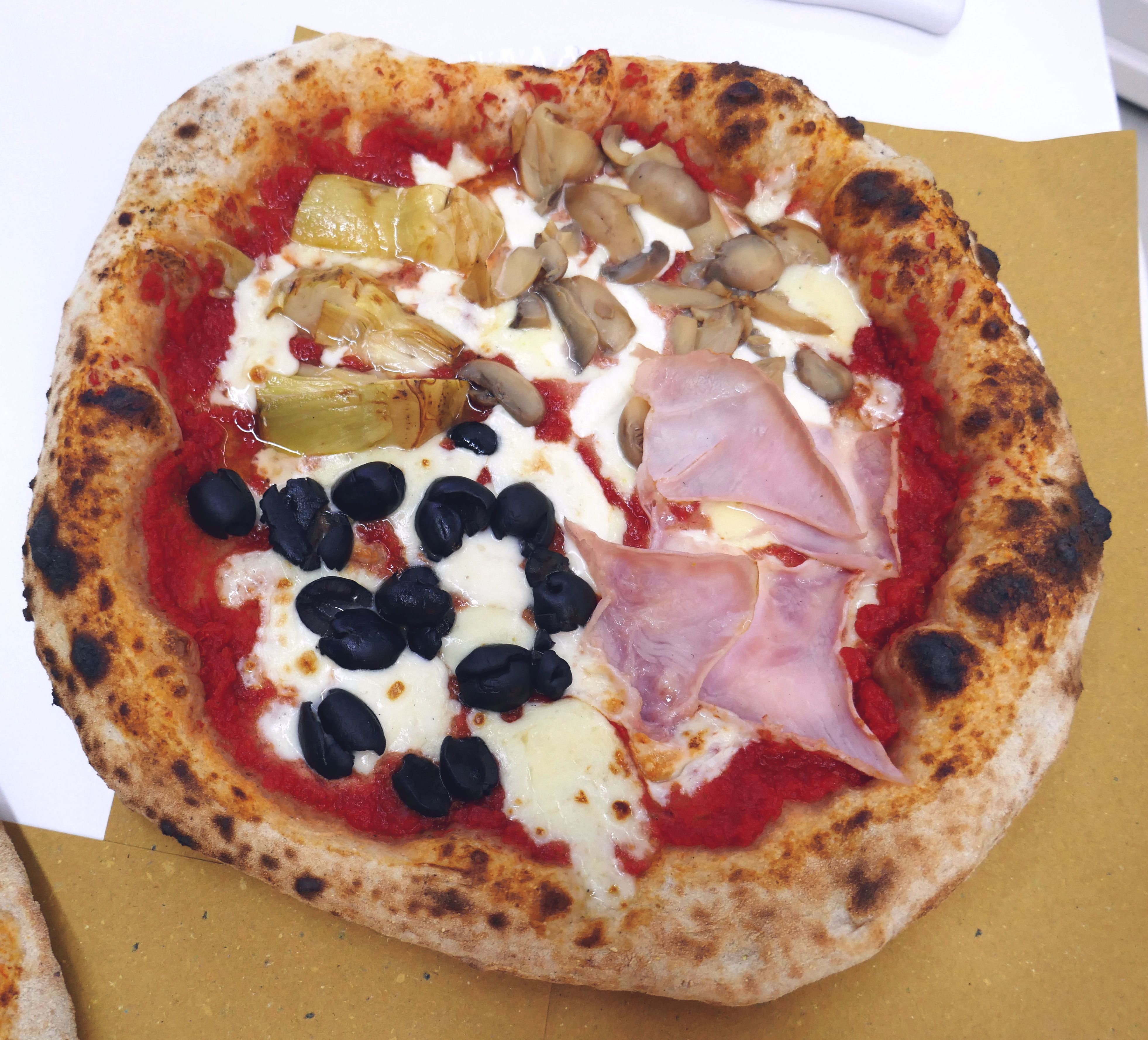 Our evening concluded with these wood-fired pizzas that cost only $13– for both! The one on the left is a traditional “pizza quattro stagioni” (four seasons), which explains why the ingredients were kept separate! Bruce and I split the pizzas, but I passed on the “winter” season.
