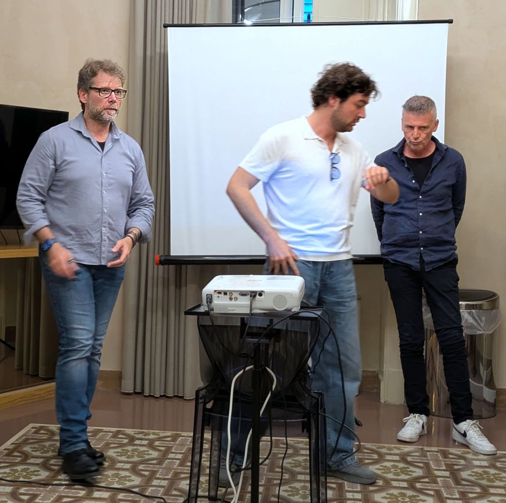 So, we now have two men with us, Gino, who despises everything the Mafia represents, and Angelo, the son of a Mafia crime boss (who is not in the Mafia himself). They are are not only in the same building, but the same room, setting up audiovisual equipment to speak with us. They were together only briefly for the preparation, but they never looked at each other. You could cut the tension with a knife. Not wanting to be obvious (and not even knowing if I was permitted to do so), I shot this quick photo of the two, with our tour leader, Francesco, in the middle: