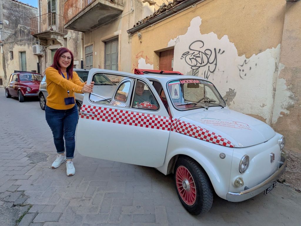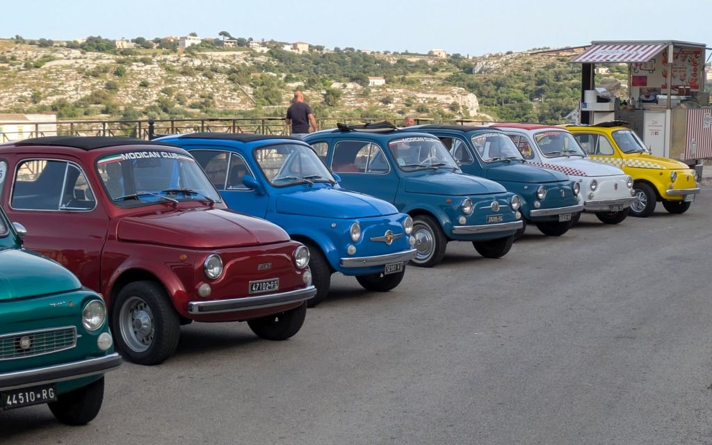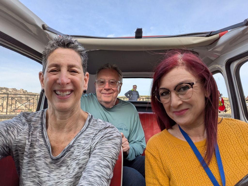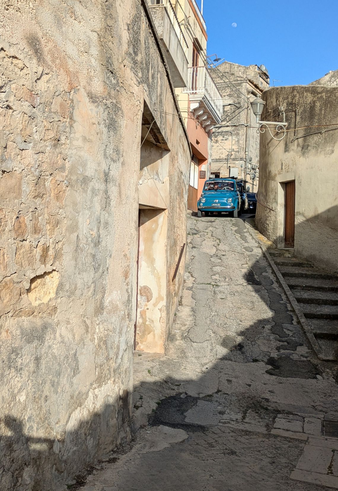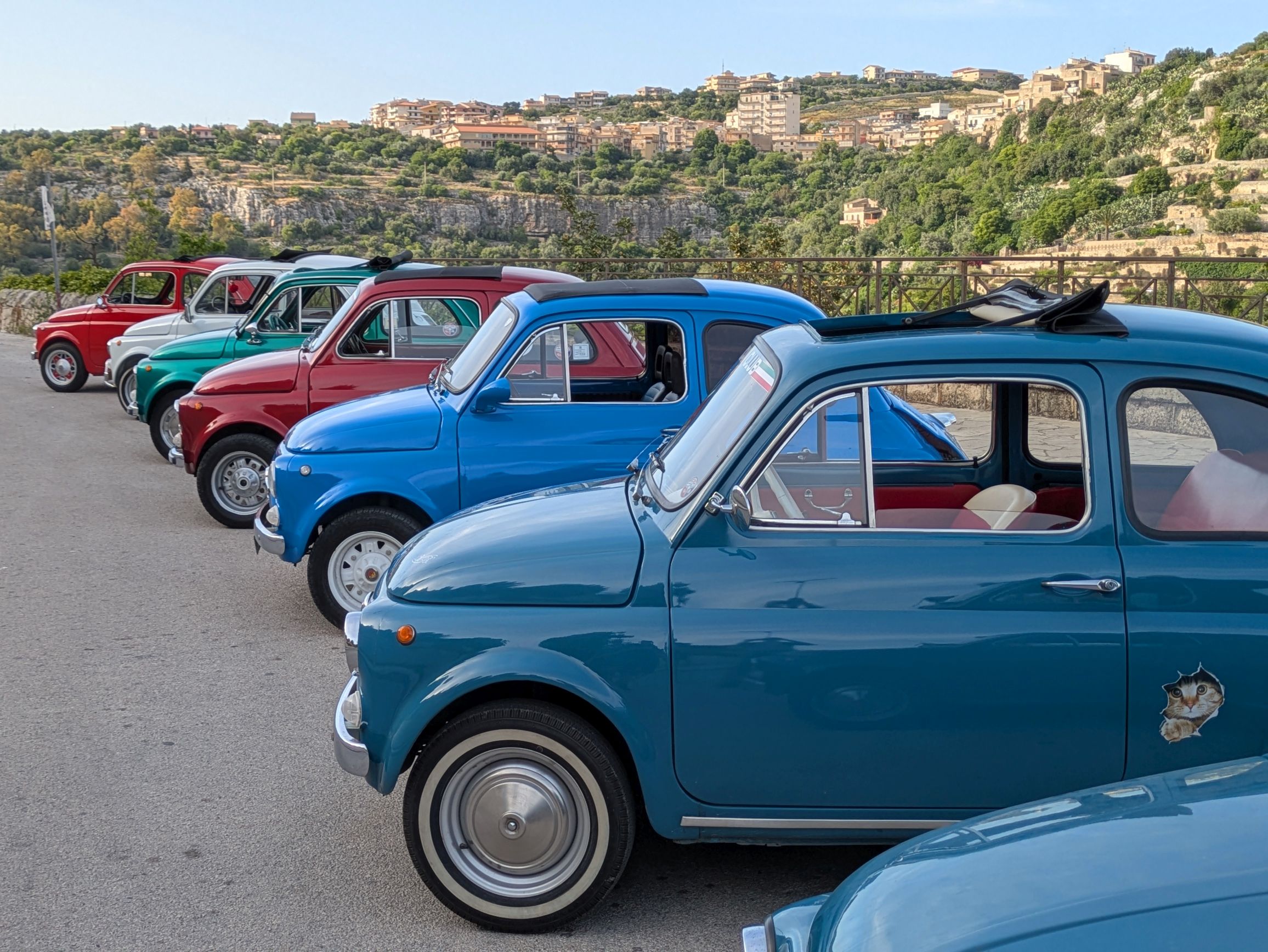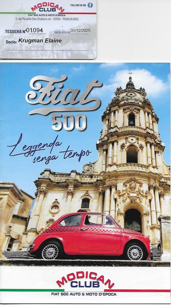 The Modican Club’s version of Mr. Toad’s Wild Ride is a drive through the streets of Modica in a vintage Fiat 500, a tiny little thing that is perfect for maneuvering through the narrow streets and lanes. Since the club isn’t a licensed tour company and are only permitted by Italian law to give rides to other club members, we were required to join the club to catch a ride. So, all sixteen of us (Uh, make that 17, because there was no way Francesco, our tour leader, was going to sit this one out!) became club members and received our official membership card.
