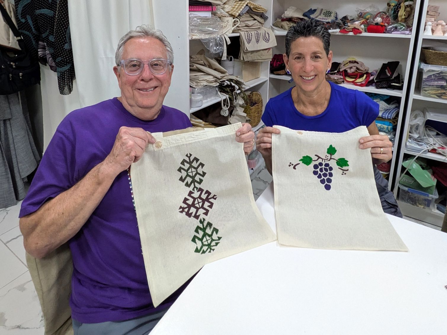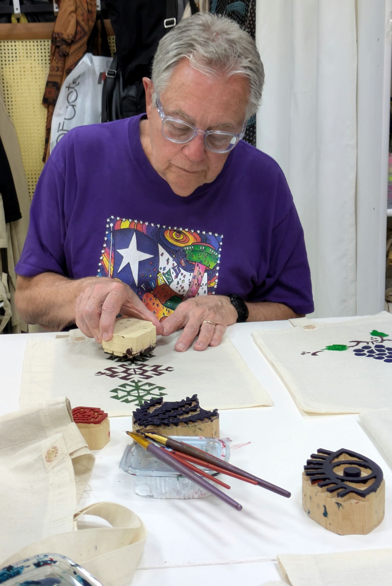 Hand-stamped tote bags are one of the products, and we had the opportunity to make our own bags with their handmade wood block stamps dipped in paint.