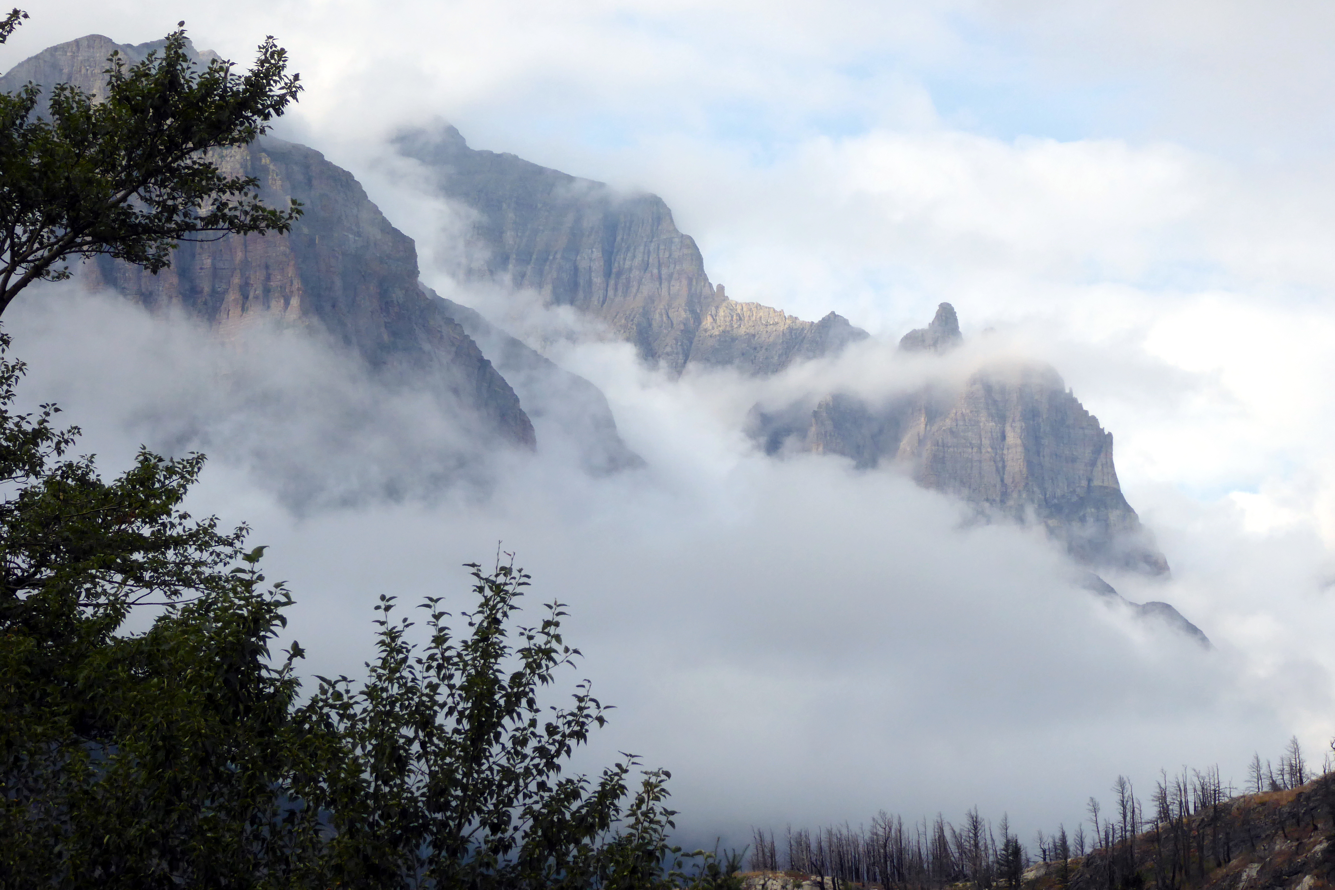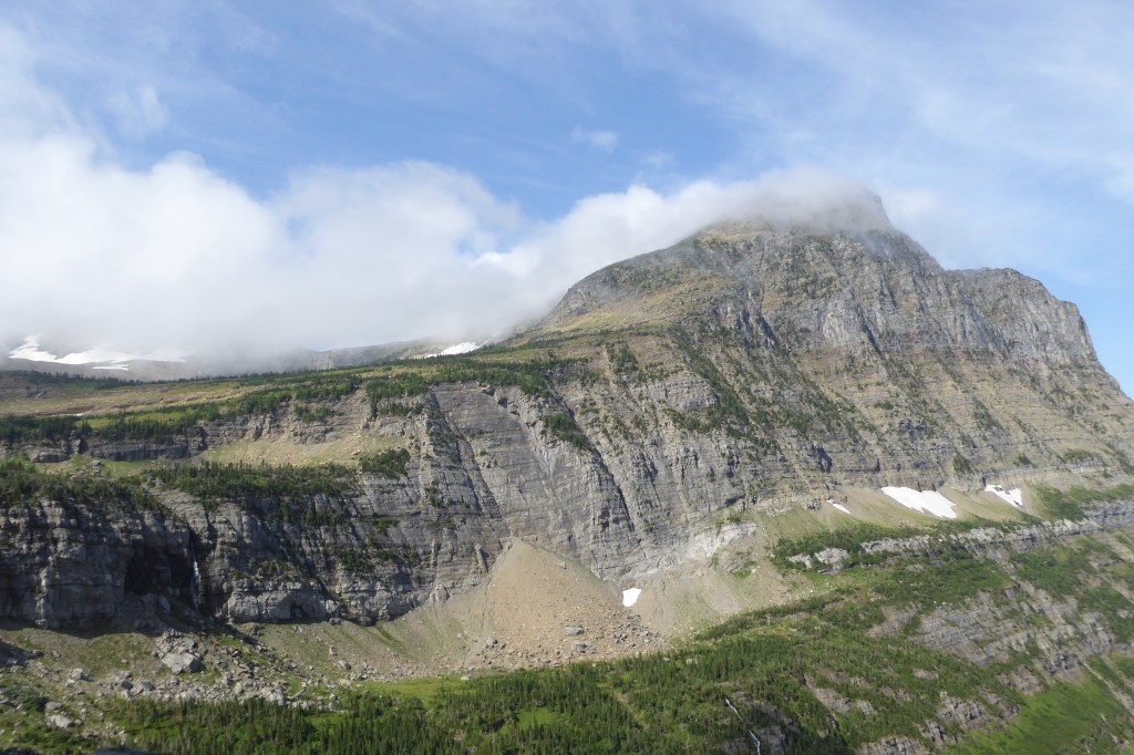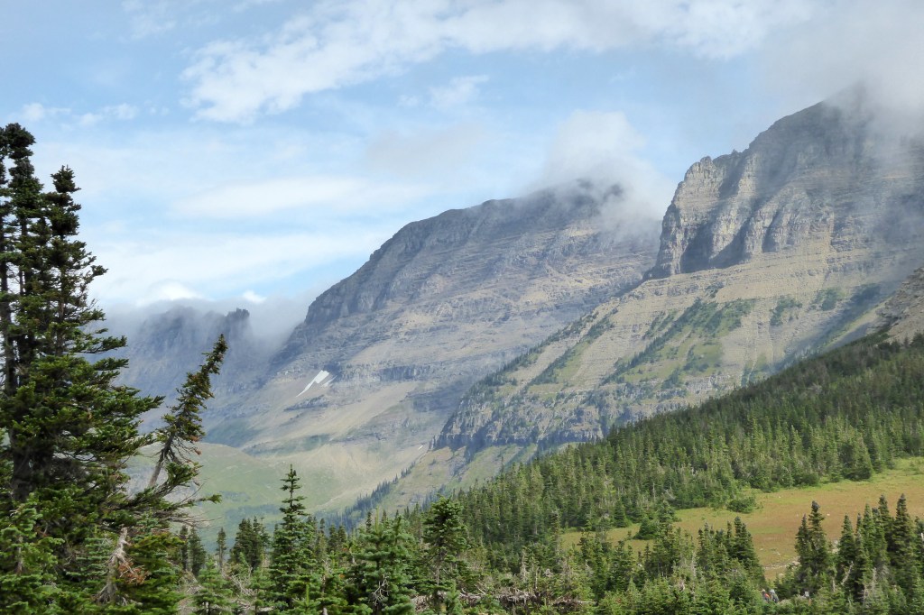 Gazing out our balcony window towards the mountains, I could see it was probably going to be another gloomy day. After I shot the photo above, clouds enveloped the mountain peaks, and rain threatened to ruin our Red Jammer ride on the iconic 50-mile Going-to-the-Sun Road.  At least that’s what we thought…