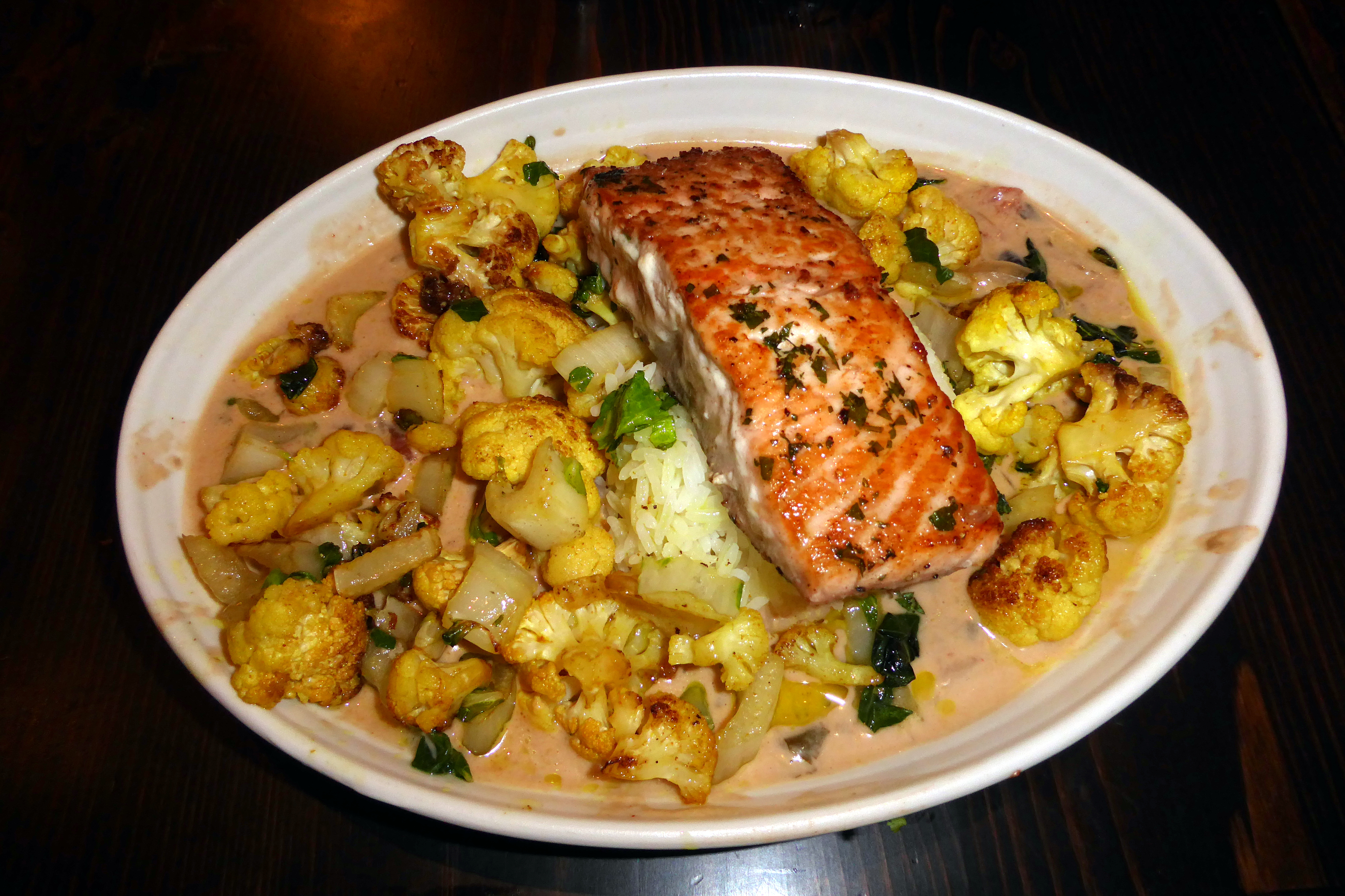 Grouse Mountain Grill was where we savored our included group dinner to put an exclamation point on the day.  The veggie option on our limited menu was grilled cauliflower, bok choy, (and more), in a coconut-ginger curry sauce.  Salmon or chicken was an optional addition, so we extended our salmon streak and thoroughly enjoyed every bite.