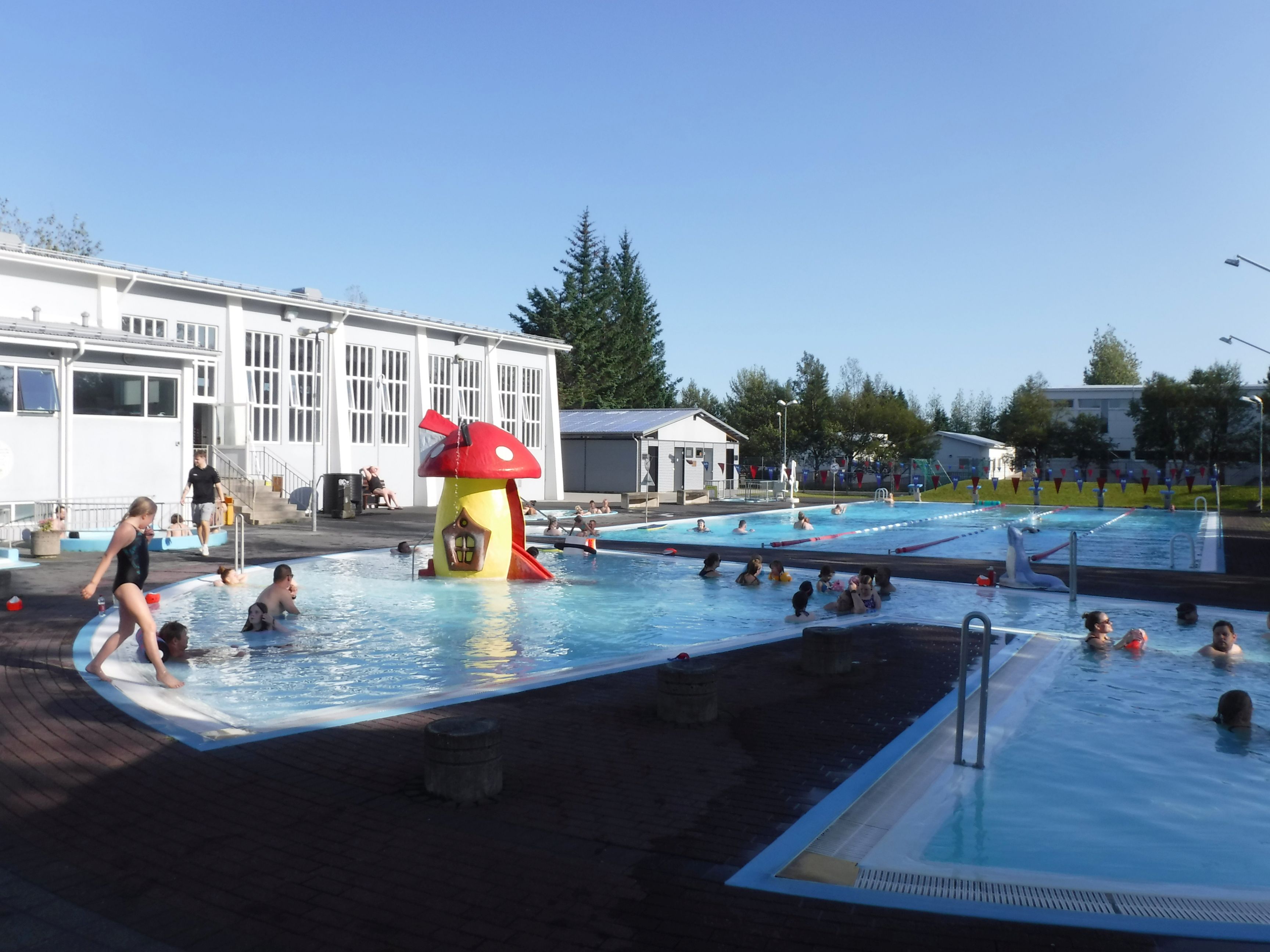 Iceland? There are public swimming pools in Iceland? Yes! There are 121(!) public swimming pools in a country roughly the size of Kentucky with less than 10% of Kentucky’s population. Even the smallest towns have a public pool with spas, which serves as the daily meeting place for the community—especially in the geothermal-heated spas where spirited conversations take place. Pools are a vital part of the typical Icelandic small-town community, and children are required to learn how to swim in early childhood.
