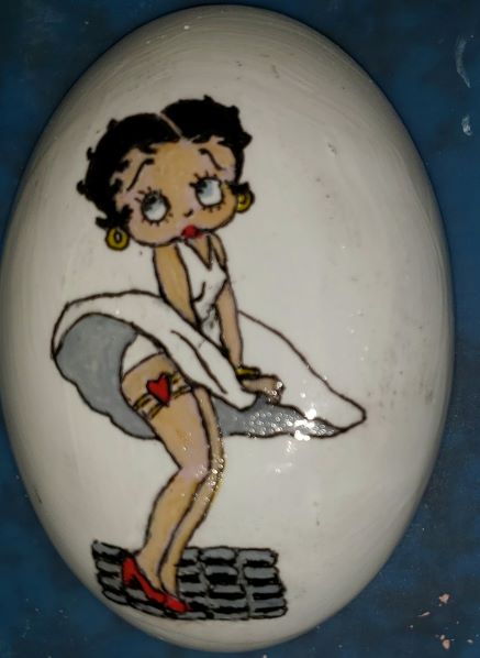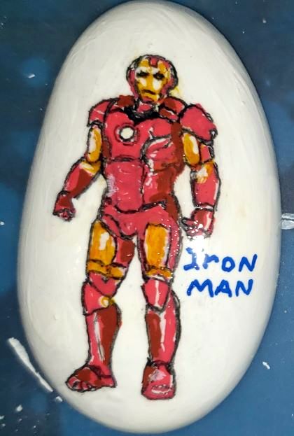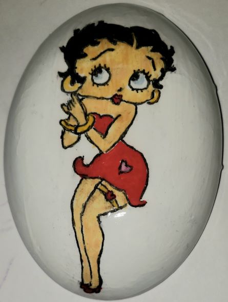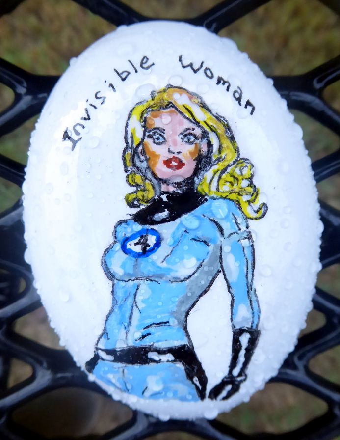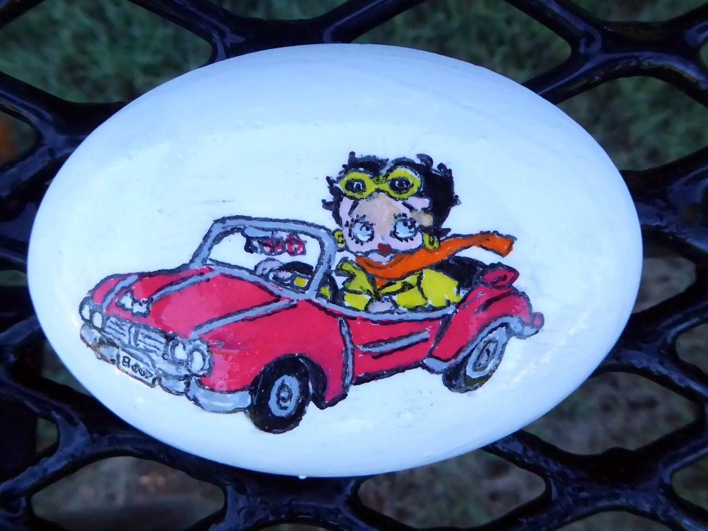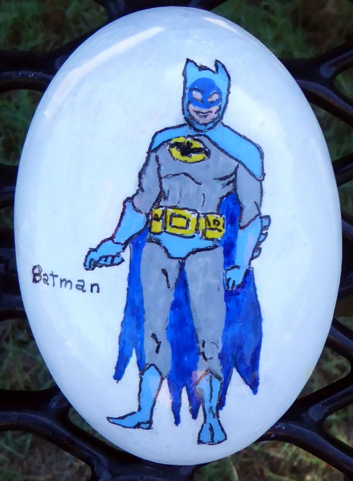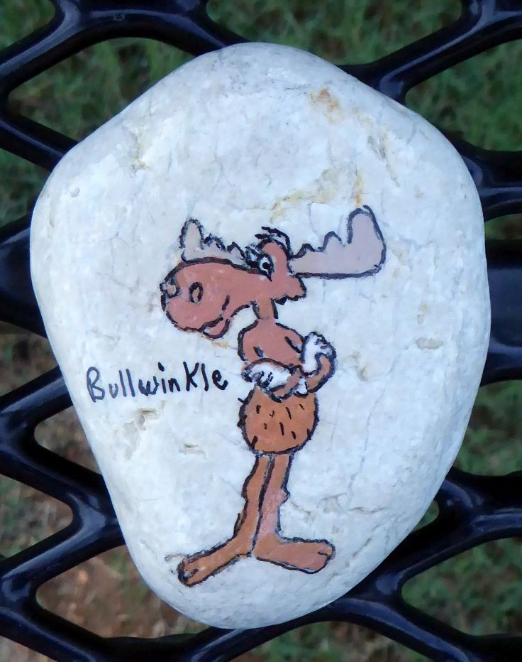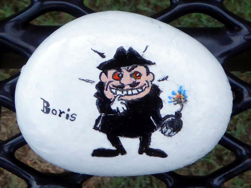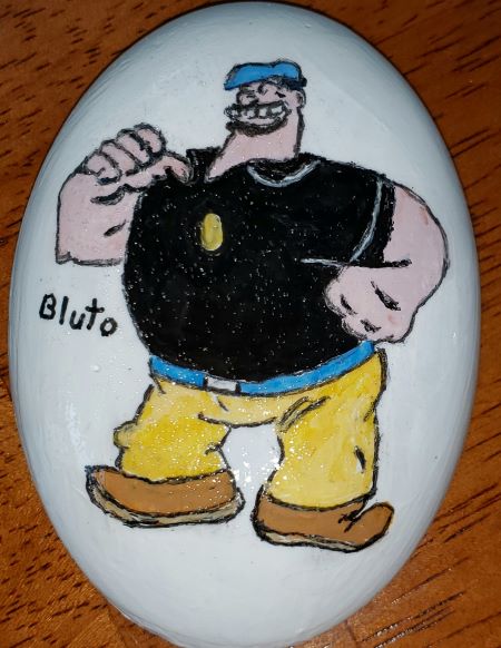 Meanwhile, as I mentioned in my previous post about Popeye, if any more of his buddies (or enemies) came along to our community, I would let you know. Although somebody snagged him off the bench before I got there, Bluto made a brief appearance. The artist photographed the rock, so I could share it with you.