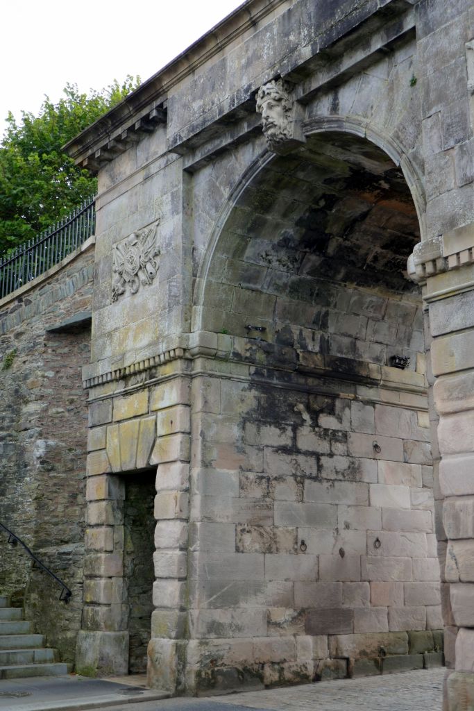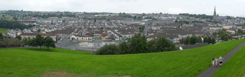 Derry is surrounded by stone walls that were built between 1613 and 1619. Following our visit to the museum, we went on a walking tour of the walls with a local guide. He pointed out that the well-off British Protestants lived inside the city walls, and the Catholics lived outside. At 9:00 PM, a bell would ring to alert any Catholics working or visiting inside the city that they had to leave and return to their ghetto. Notice the difference between the neighborhoods outside the walls and inside, in the pictures below. This first shot was taken from on top of the city wall, looking down to where the Bloody Sunday Massacre took place in the Irish Catholic neighborhood, outside of the walls.