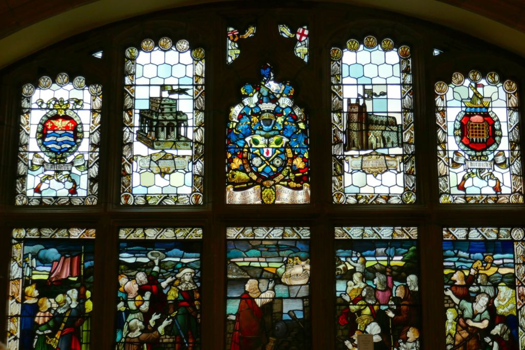 A series of stained glass windows in a hallway were lit up beautifully by the sunlight shining through. All of the windows depicted historically significant events in Belfast’s history.
