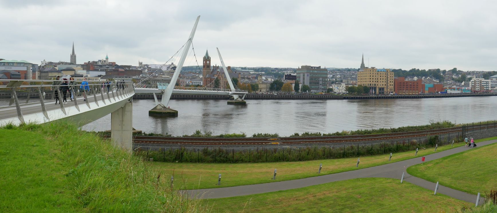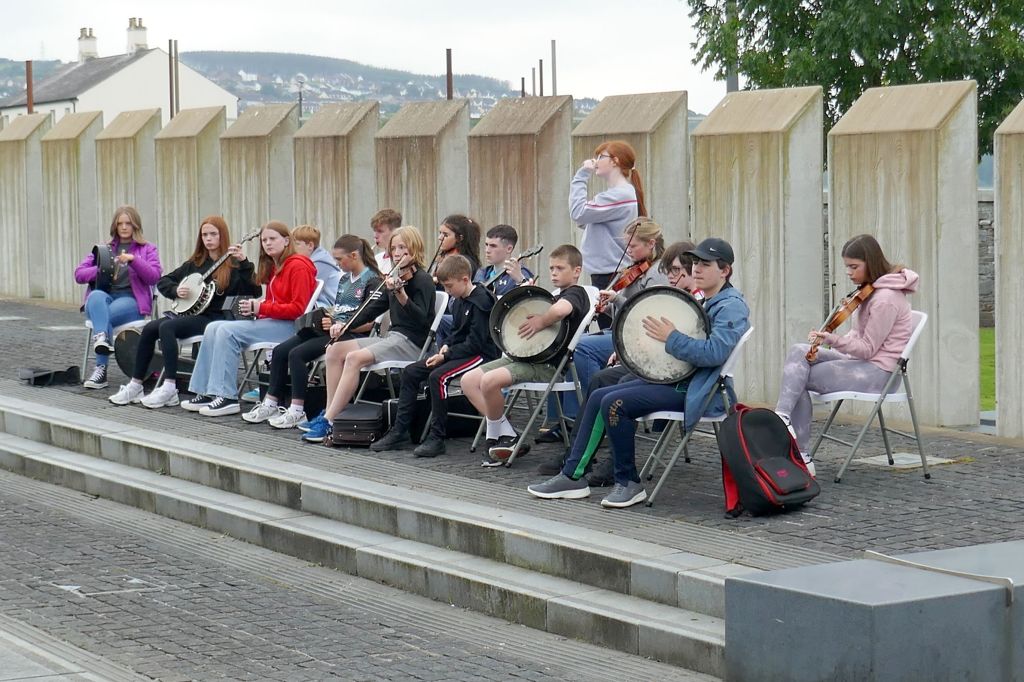 The Peace Bridge is in the background, and we walked it to the other side of the river.When we arrived, this youth band was playing traditional Irish music.A view across the Peace Bridge back to the city center and Guildhall.