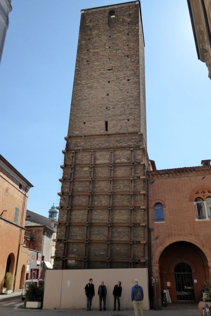 This is not wide angle distortion, folks. This tower really was leaning! Supports have been added to the bottom section to prevent it from toppling over.