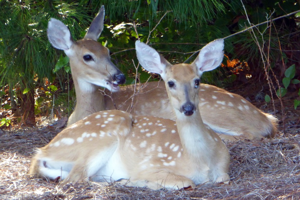While riding the chairlift back down, we were treated to sweet view of a mother and baby deer cuddled up under a tree. Wildlife! I tried to get a picture, but the chairlift was moving too quickly, and I missed it. Oh well, how about these two babies that were hanging out in our backyard (several years back), while their mom foraged for food, instead?