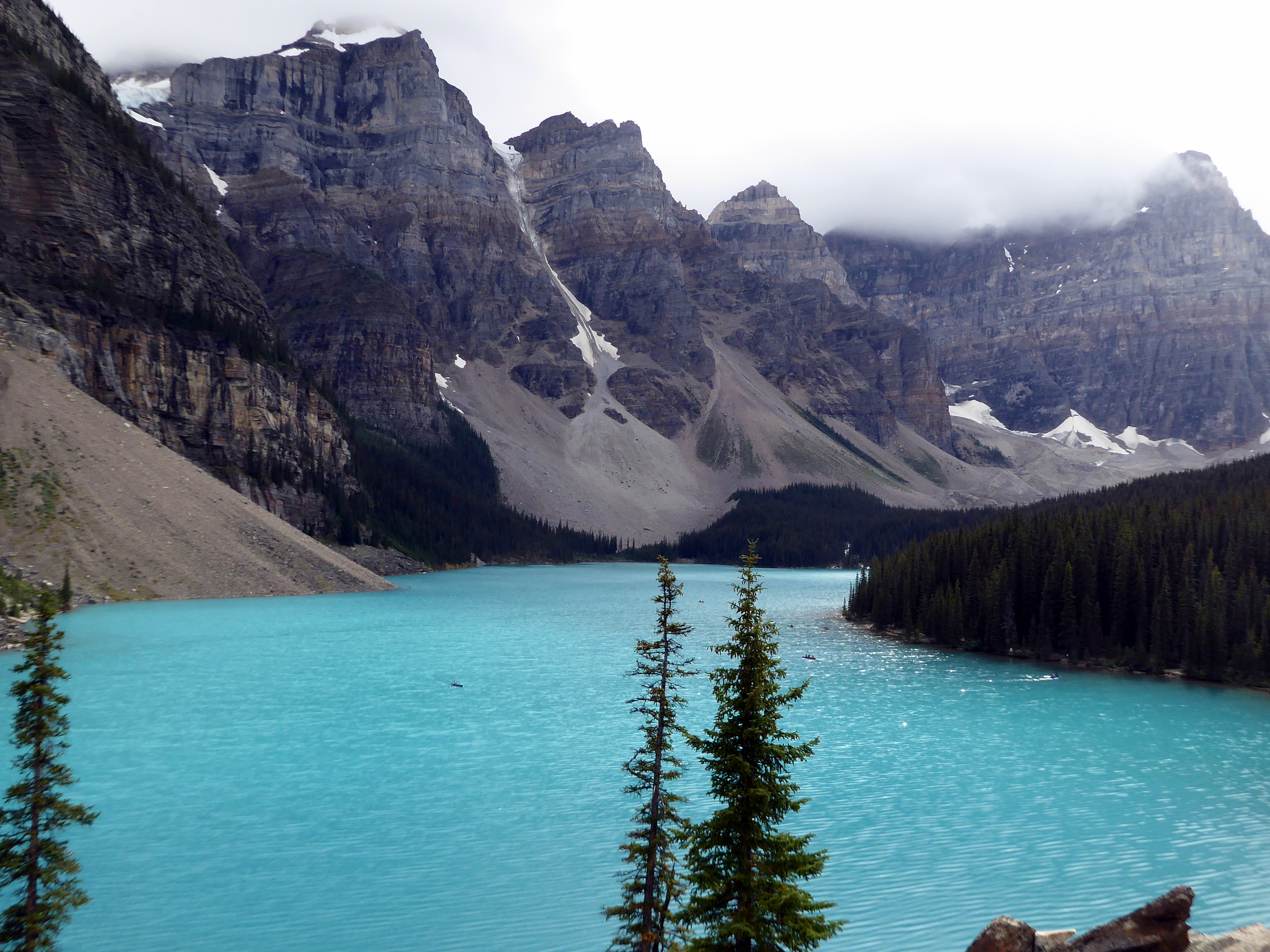 The day had been gloomy, and when we arrived, we couldn’t even see the ten mountain peaks surrounding the lake, due to the cloud cover. We made it into the lot, though, so at least we could see some bright blue water. Good enough for me; blue is my favorite color!