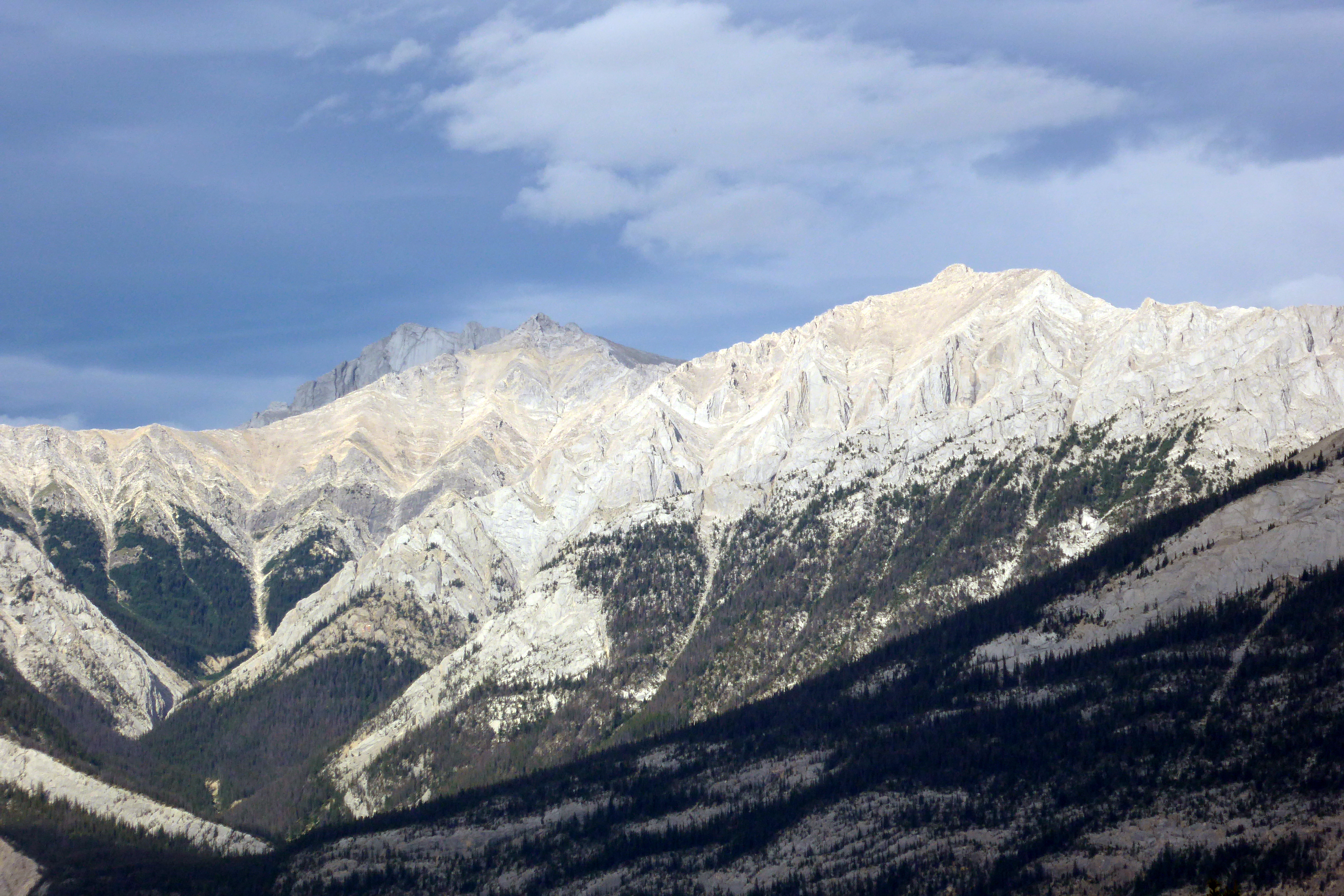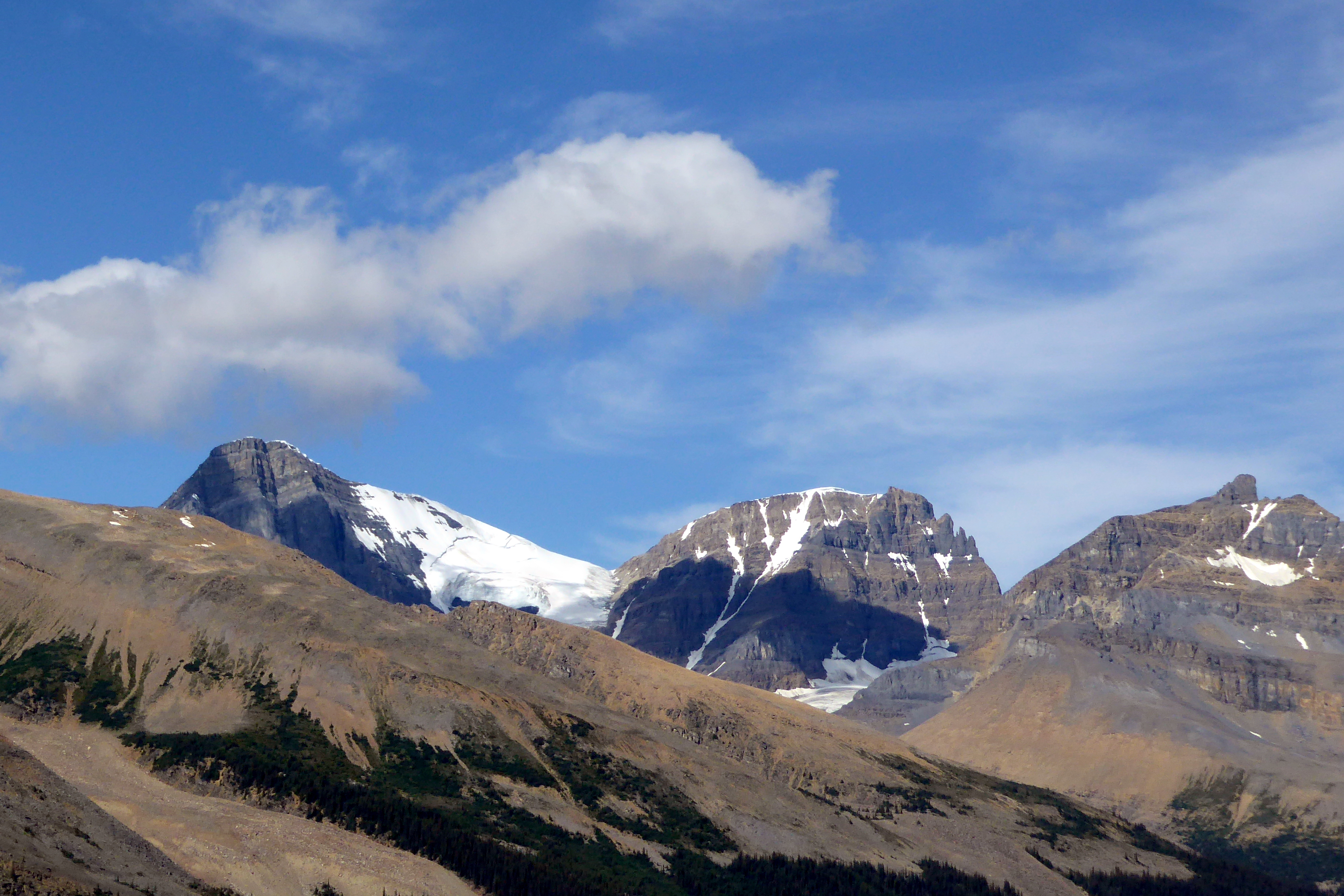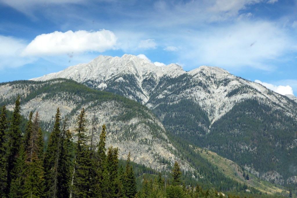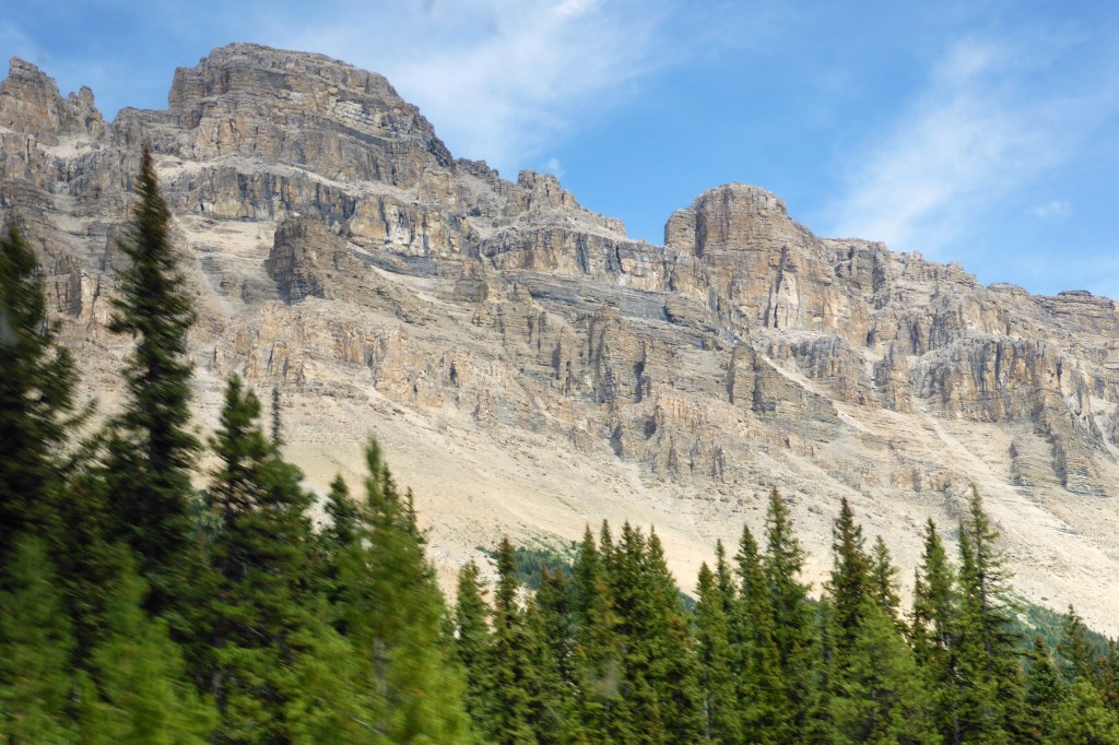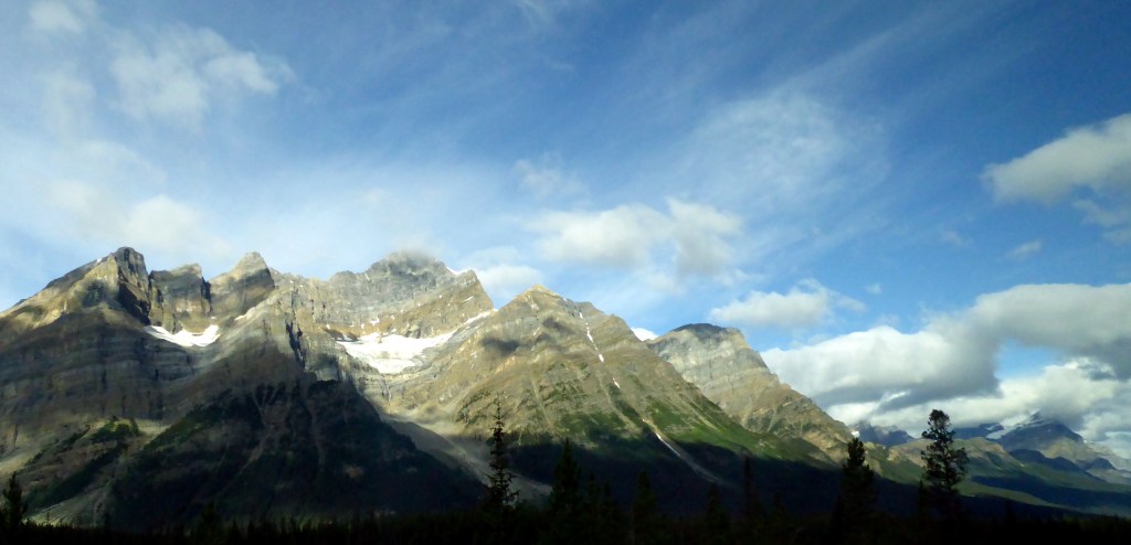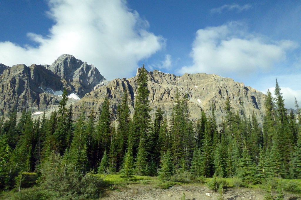 Meanwhile, the drive between each stop along Columbia Icefields Parkway was stunning—so much prettier than two days prior! Unfortunately, bugs on the bus windshield ruined what would have been some nice shots, but here they are anyway: