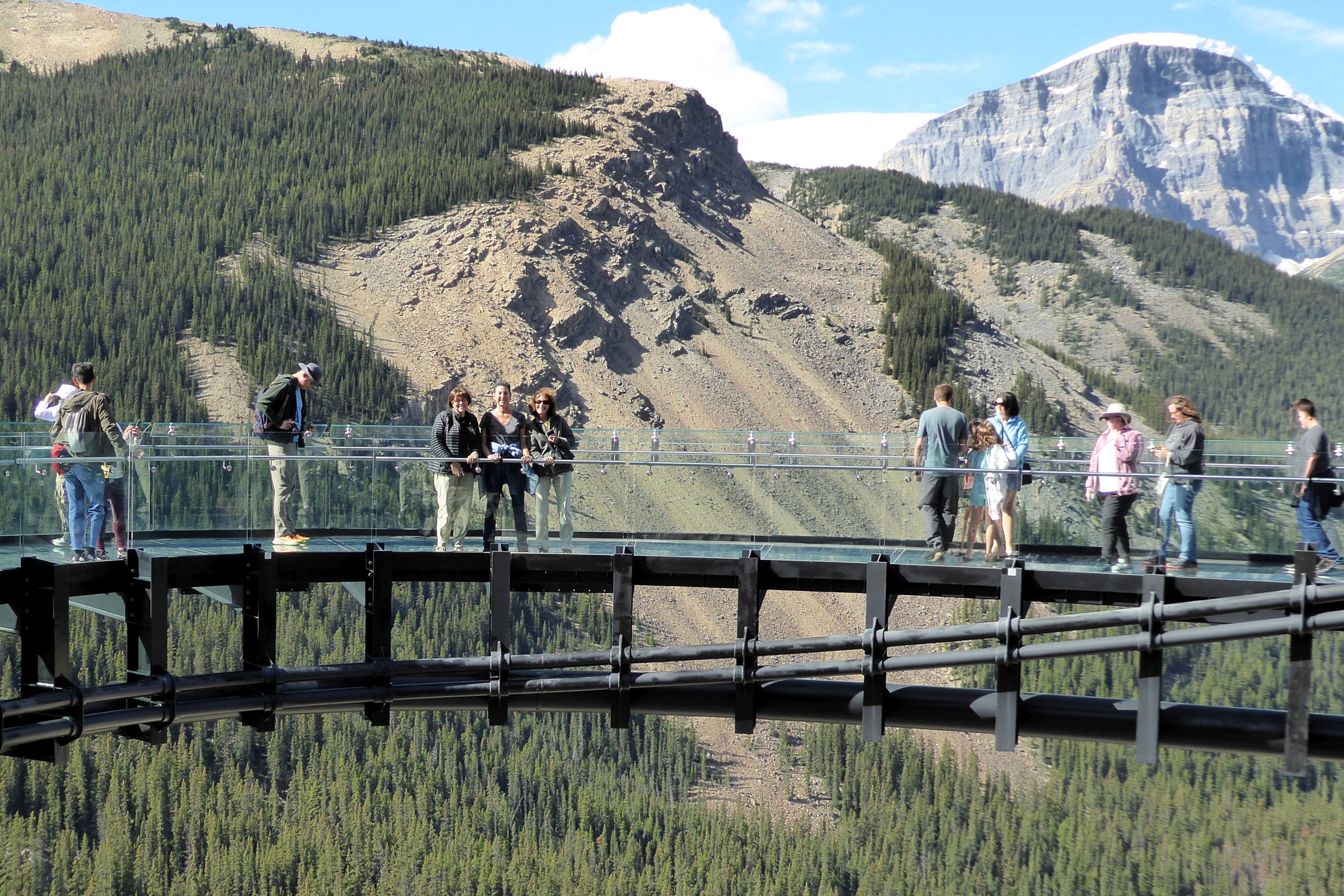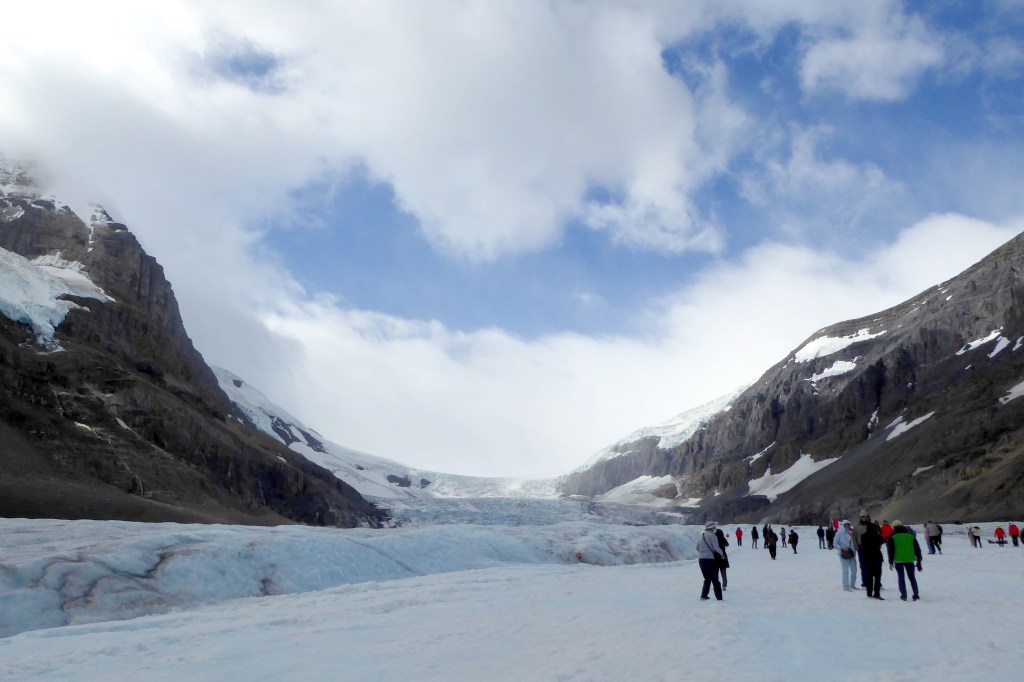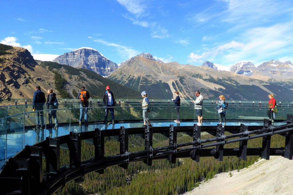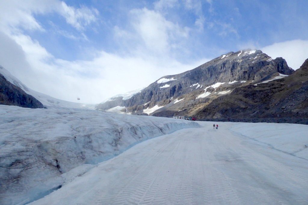 Next stop was back at the Columbia Icefields base station to catch our shuttle bus to Glacier Skywalk. If there was any day to do it, this was the day. The sun was shining bright, there were beautiful white clouds in the sky, and my jacket came off to enjoy the comfortable 75-degree temperature.