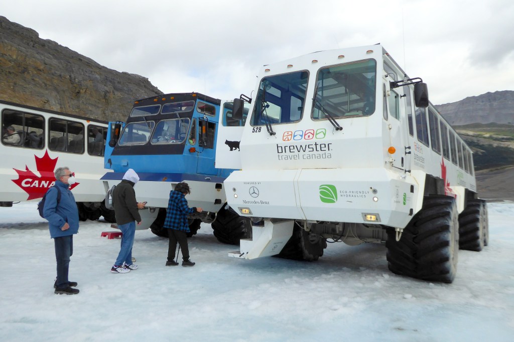 An Ice Explorer all-terrain vehicle transported our group to Athabasca Glacier—the most visited glacier in North America. Equipped to drive right onto the glacier itself, the vehicle has 5-1/2-feet-tall tires especially designed for glacier travel. Each one of these super-sized tires costs $6,000! The vehicles were originally purchased for $500,000 each; however, when they were due for refurbishing, $750,000 was spent on each vehicle, for a total investment of 1.25 million for each Ice Explorer.