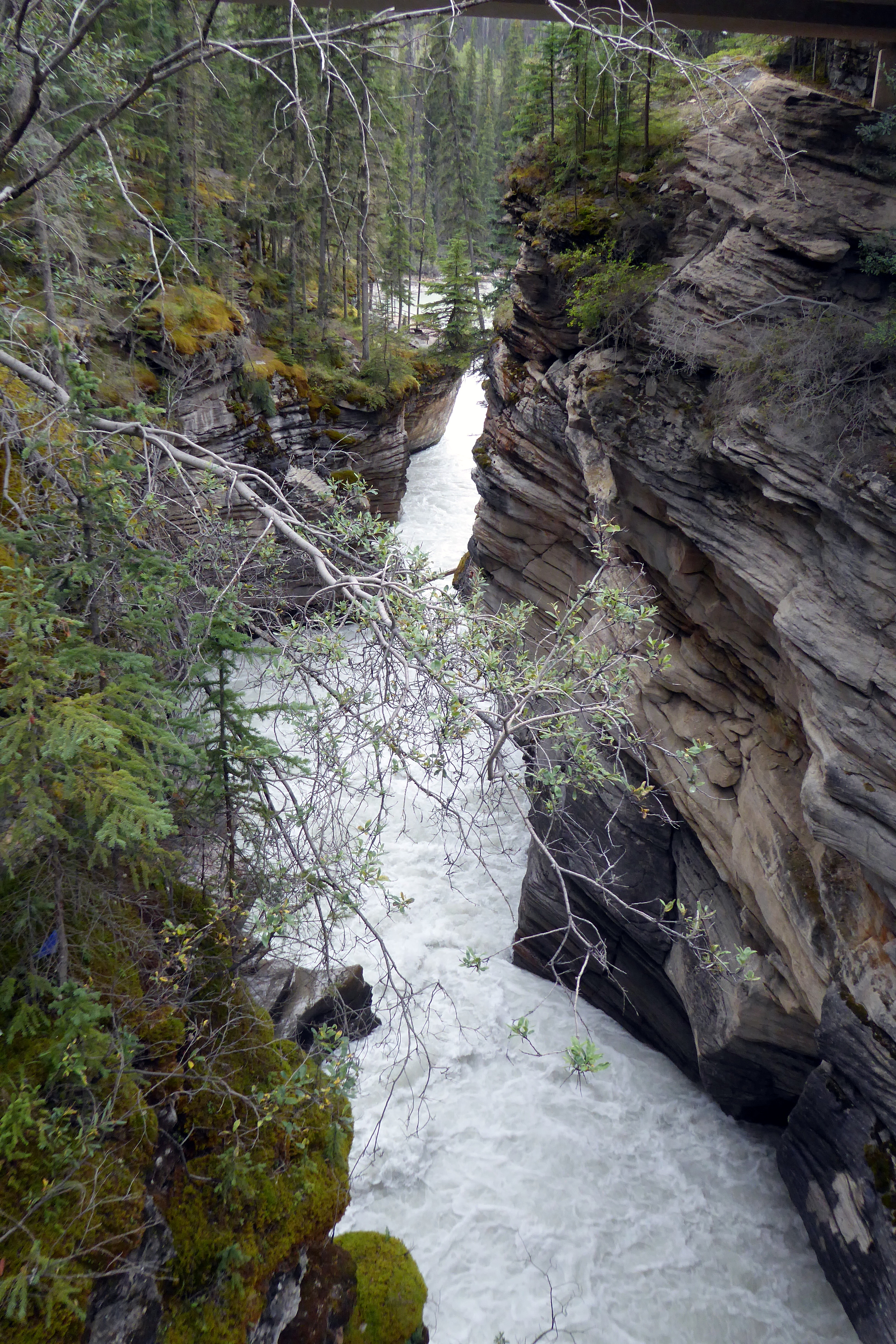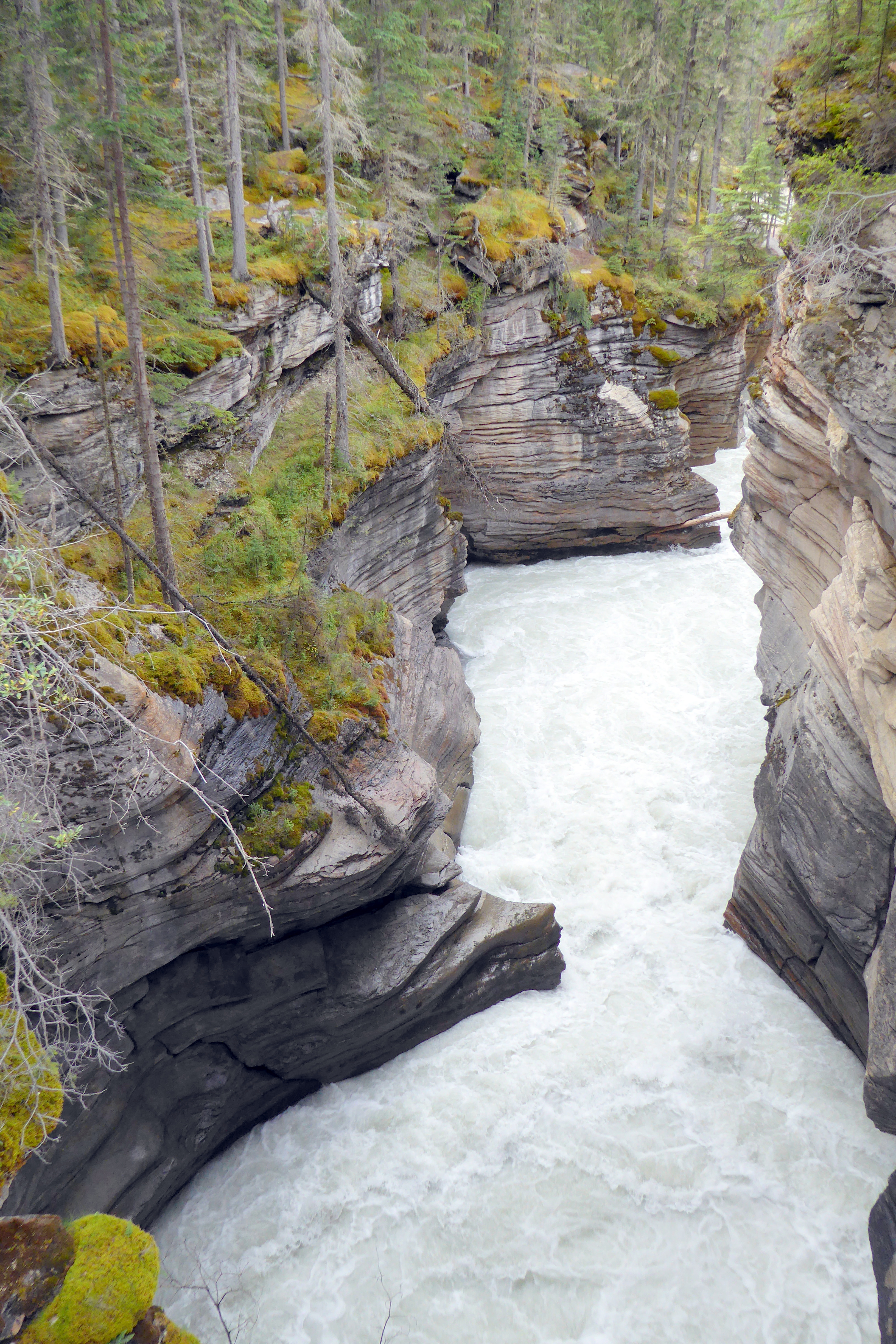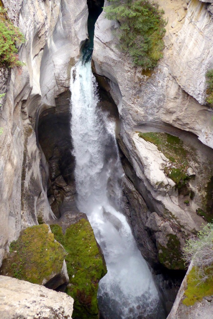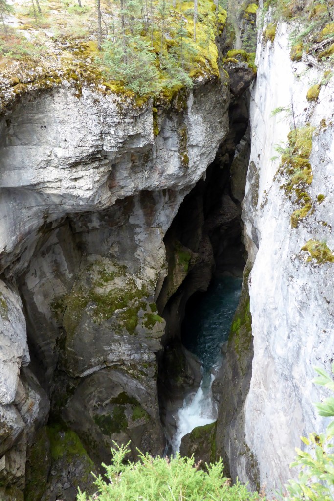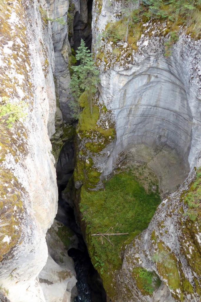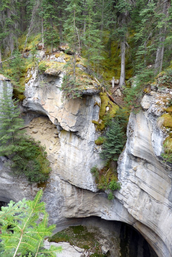 Following our cruise, we hiked around Maligne Canyon, a magnificent 160-feet deep slot limestone canyon that is only six feet wide at its narrowest point. Maligne Riverflows out of Medicine Lake, and then drops down the canyon. It is constantly being eroded by the churning and swirling of the water, and the resulting limestone formations were fascinating—and, photogenic.