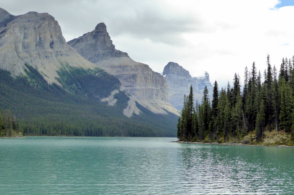 The day was mostly cloudy, so the views during our boat tour of the lake were not as spectacular as we had hoped, especially considering that it is rated the most beautiful boat tour in Canada. Still, the scenery was amazing! And, we were able to see all three glaciers as well as Spirit Island, considered one of the most beautiful and photographed locations in all of Canada.