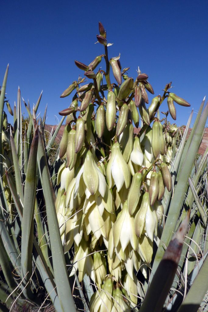 After getting a birds-eye view of the park, we went to the floor of the park’s canyon to walk a path and get close-up views of the beautiful spring desert flowers and sandstone formations. The moon was still visible against the clear blue sky, so the group enjoyed taking strategically framed photos along the way.