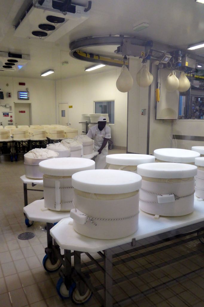 Back to the cheese-making process, that guy in the black hat is the Cheese Master. It takes fifteen years of experience to get to that level, so he is an expert at overseeing his team and the cheese.