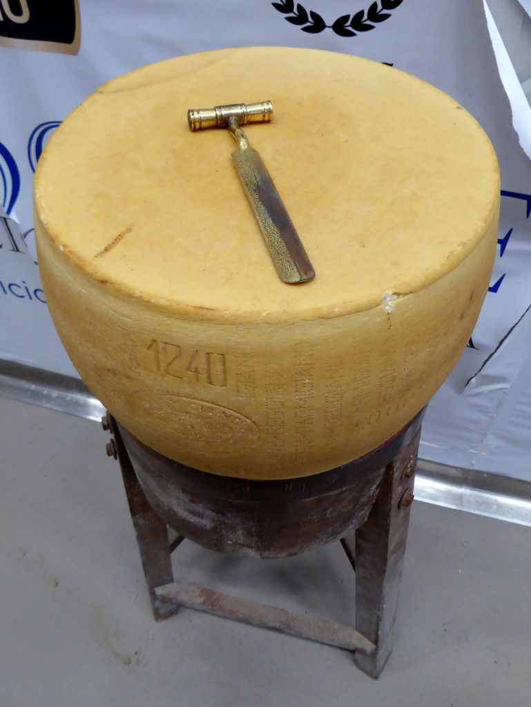 A wheel of cheese typically weighs about 92 pounds; however, the older the wheel, the drier and smaller it will be. It will also make a higher-pitched sound when tapped with the hammer.