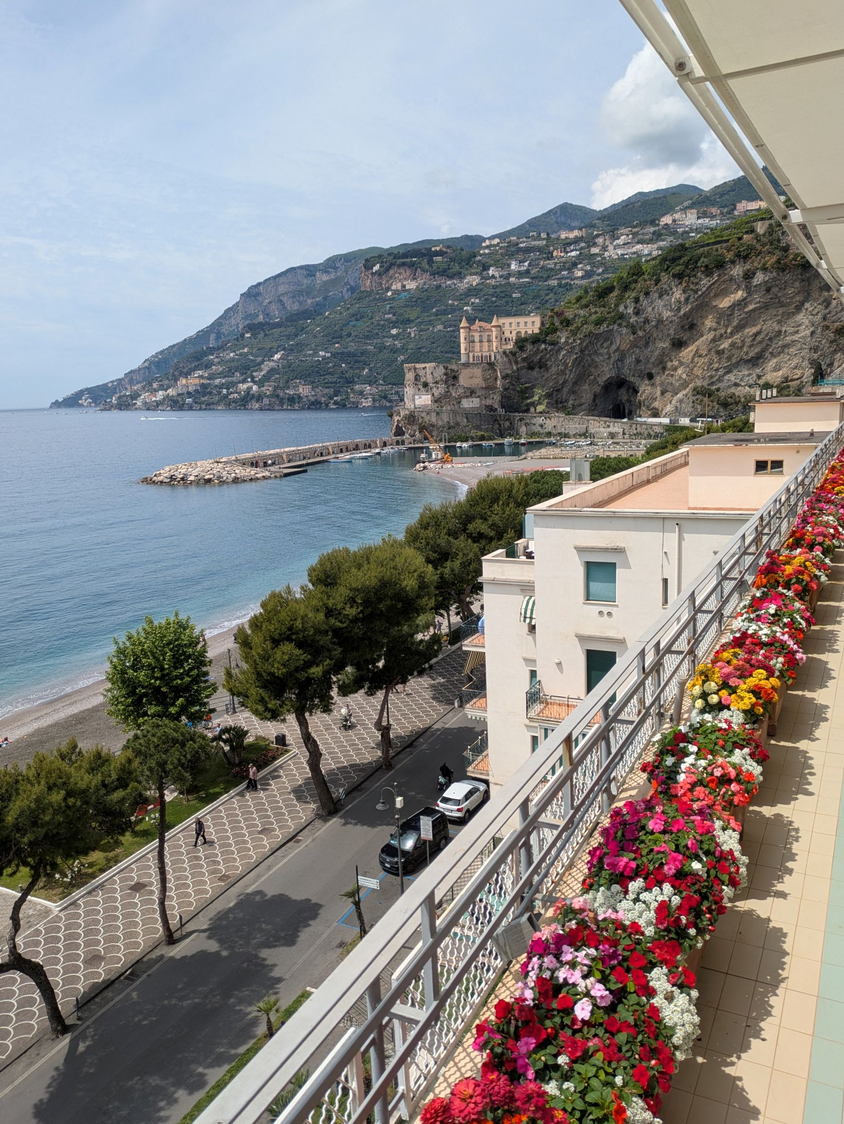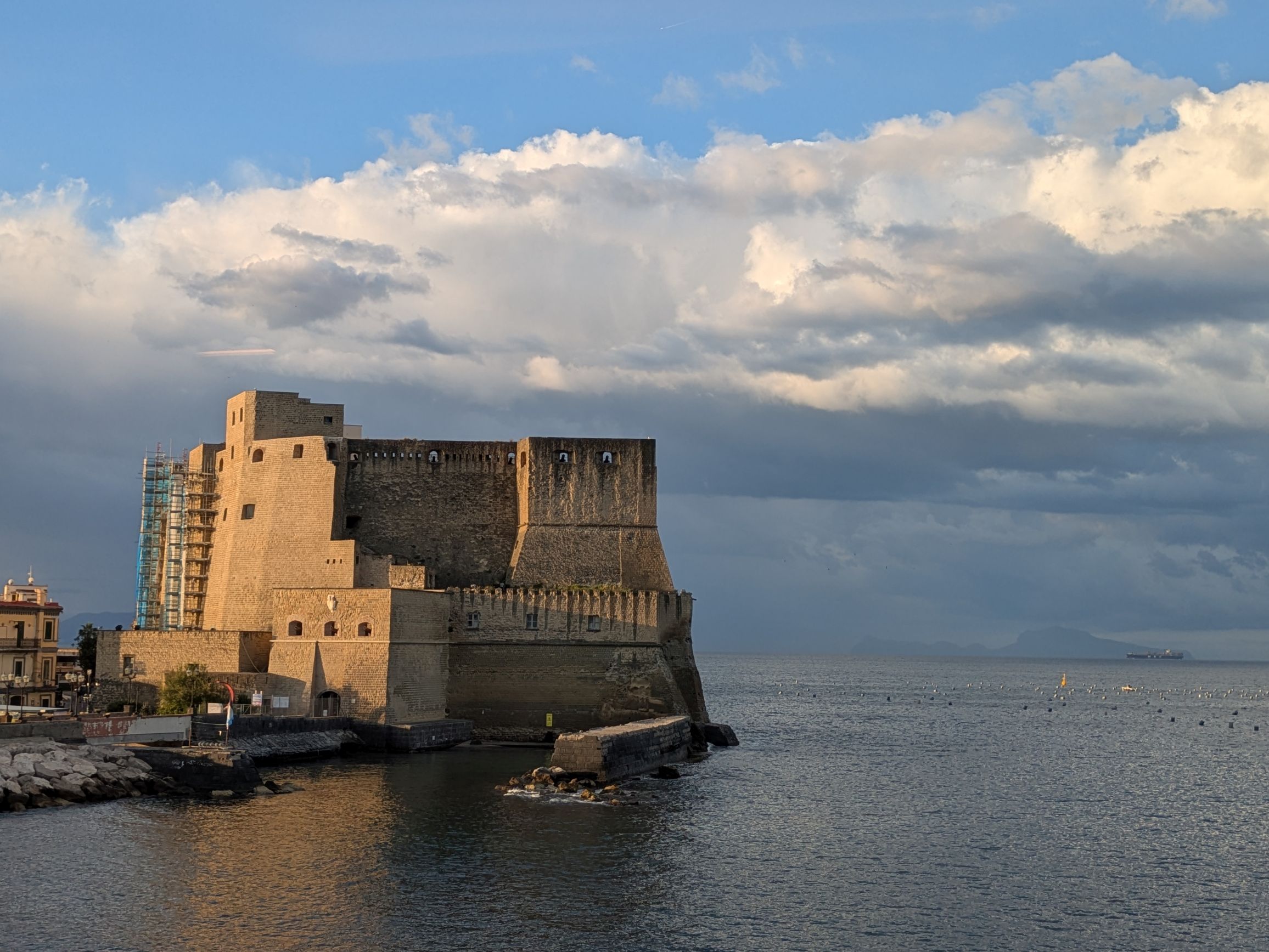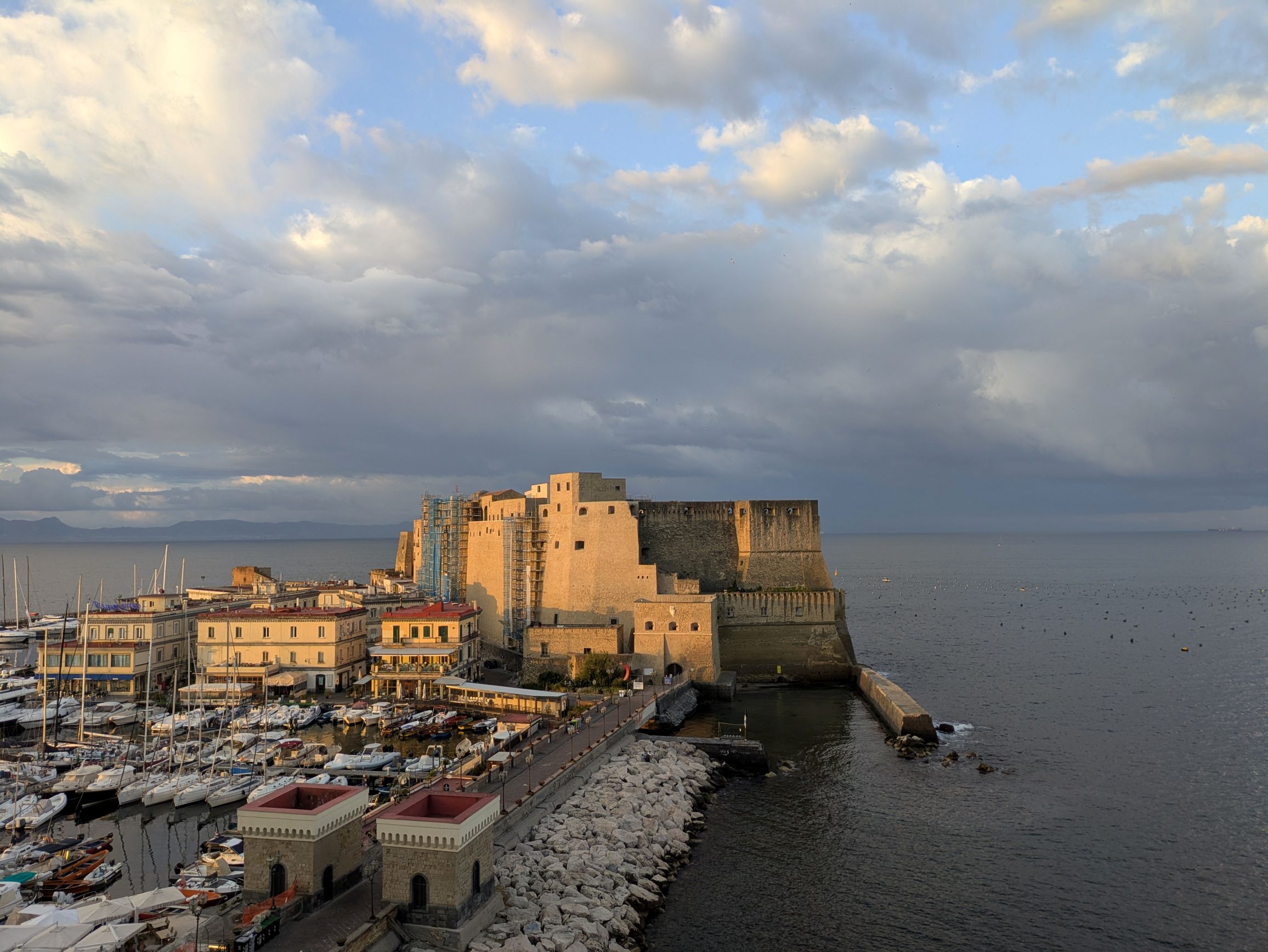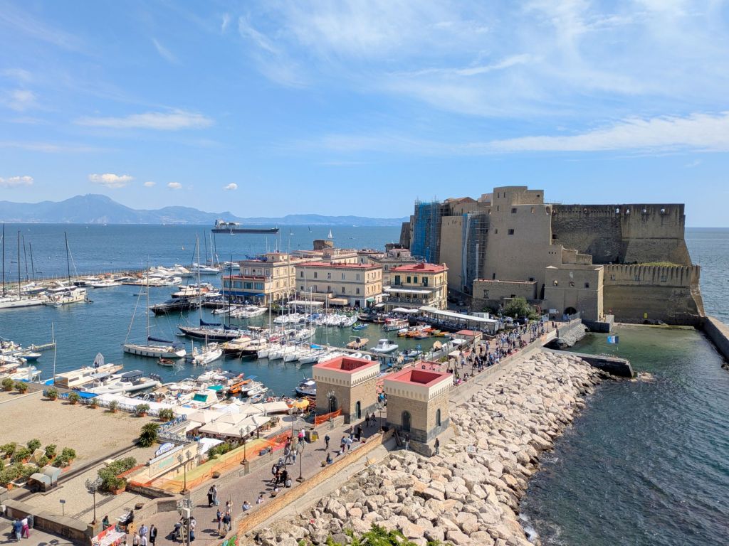 Our hotel, Royal Continental, was located on the seafront promenade with gorgeous views of the Bay of Naples. Fortunately, we had lovely weather, so we could enjoy the views and walks along the promenade. This was the view from our room during different times of the day and evening: