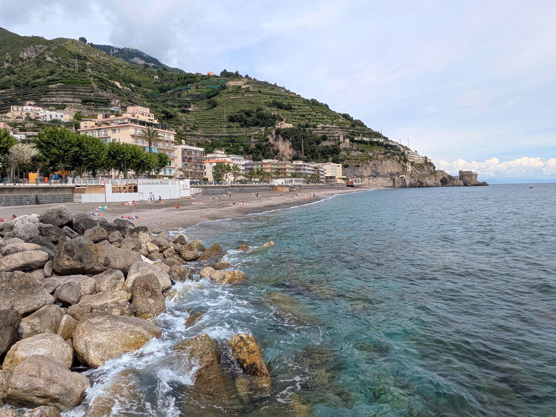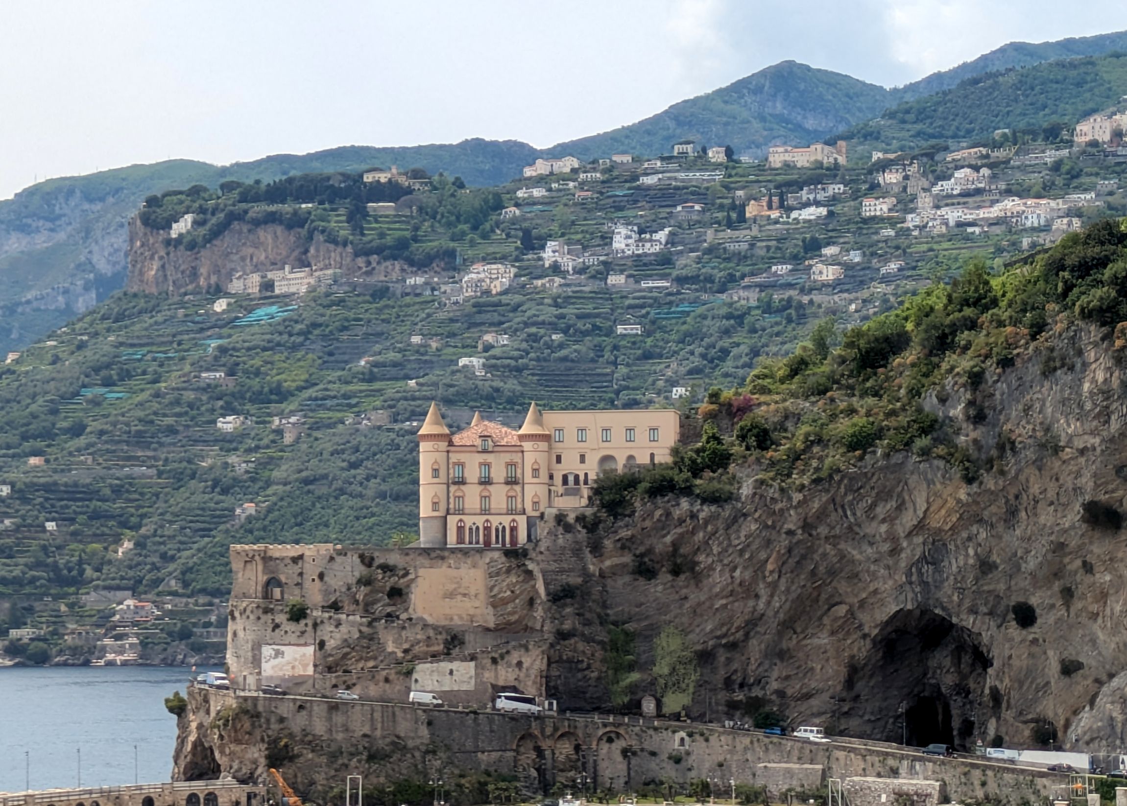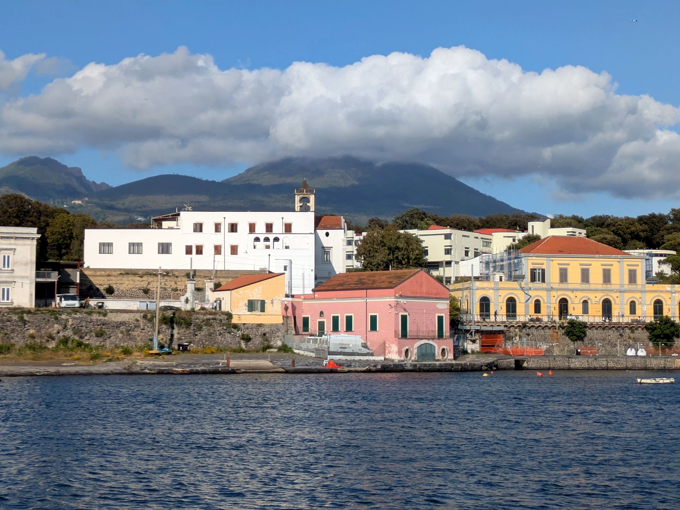 Our hotel, Royal Continental, was located on the seafront promenade with gorgeous views of the Bay of Naples. Fortunately, we had lovely weather, so we could enjoy the views and walks along the promenade. This was the view from our room during different times of the day and evening: