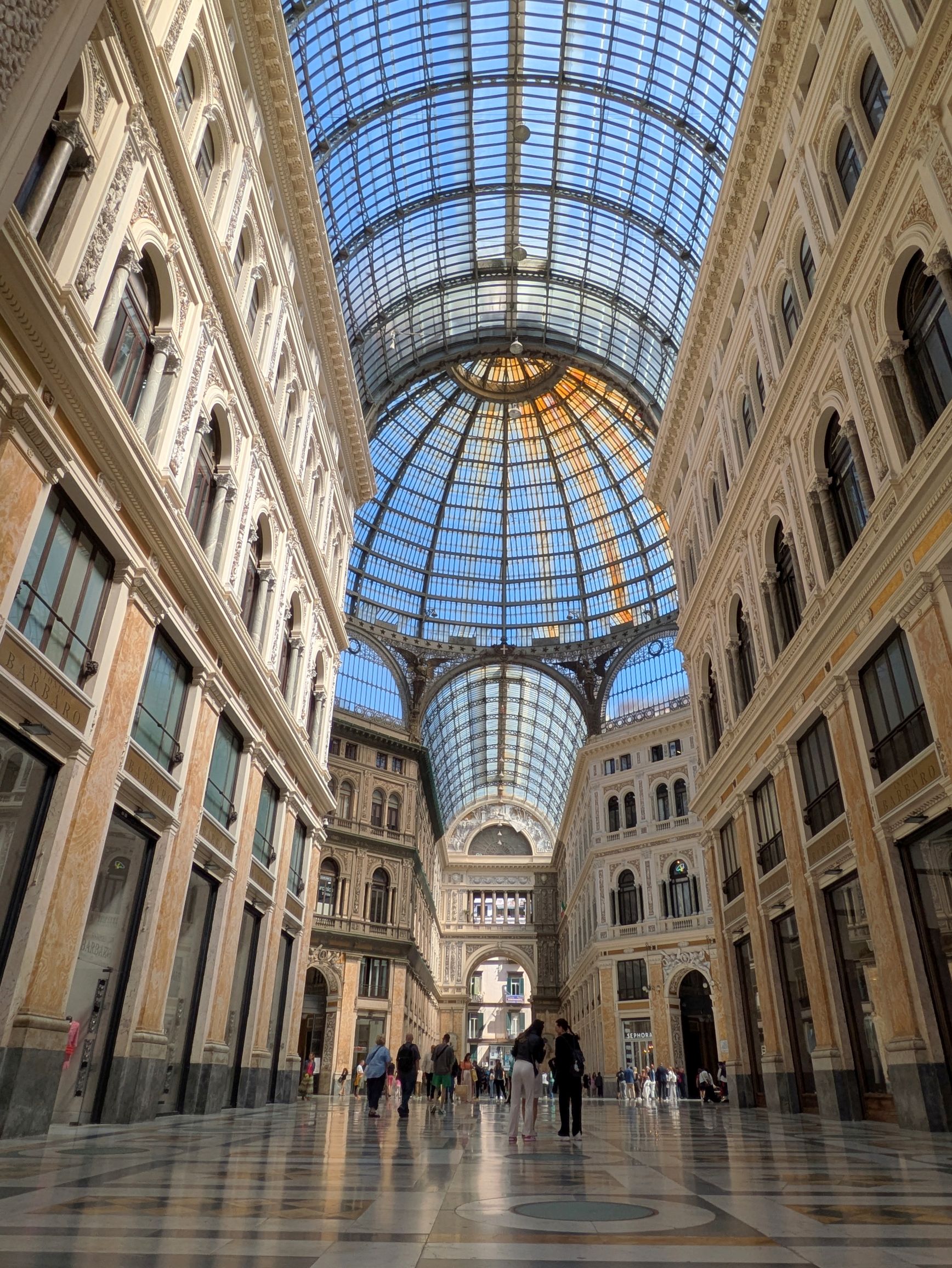 Although I am not a fan of shopping malls, one of the most beautiful places we visited was Galleria Umberto I, a gorgeous shopping gallery with extremely high-end stores. The architecture was exquisite! Built in the late 1800’s, the Galleria was named after the king of Italy at the time. The most spectacular aspect of the architecture is the glass dome: