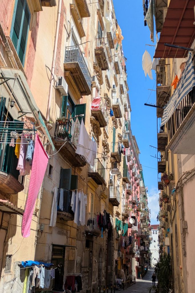 A fun place to poke around was Quartieri Spagnoli (Spanish Quarter), an eighteen streets by twelve grid with a population of 14,000 people that dates to the 16th century. The place is bustling, and motorcycle riders occasionally zip by on the narrow streets. They don’t seem to care about pedestrians, and I nearly got hit, making me wish I had eyes in the back of my head! Still, it was an enjoyable area to explore and photograph.