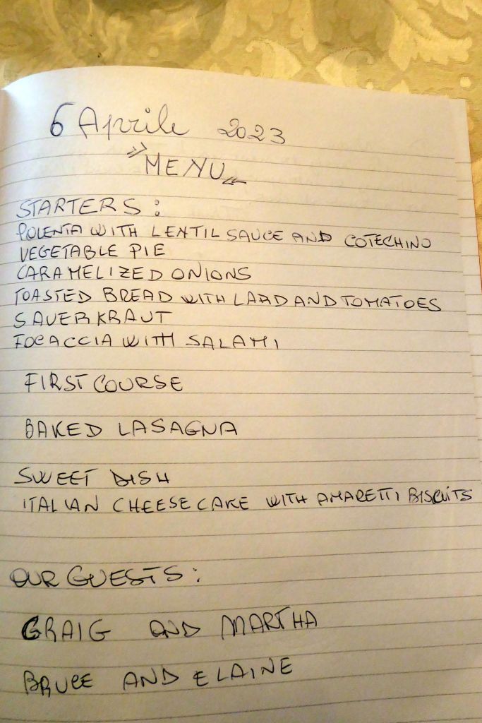 We were treated to a lovely home-cooked meal, as detailed in this menu: