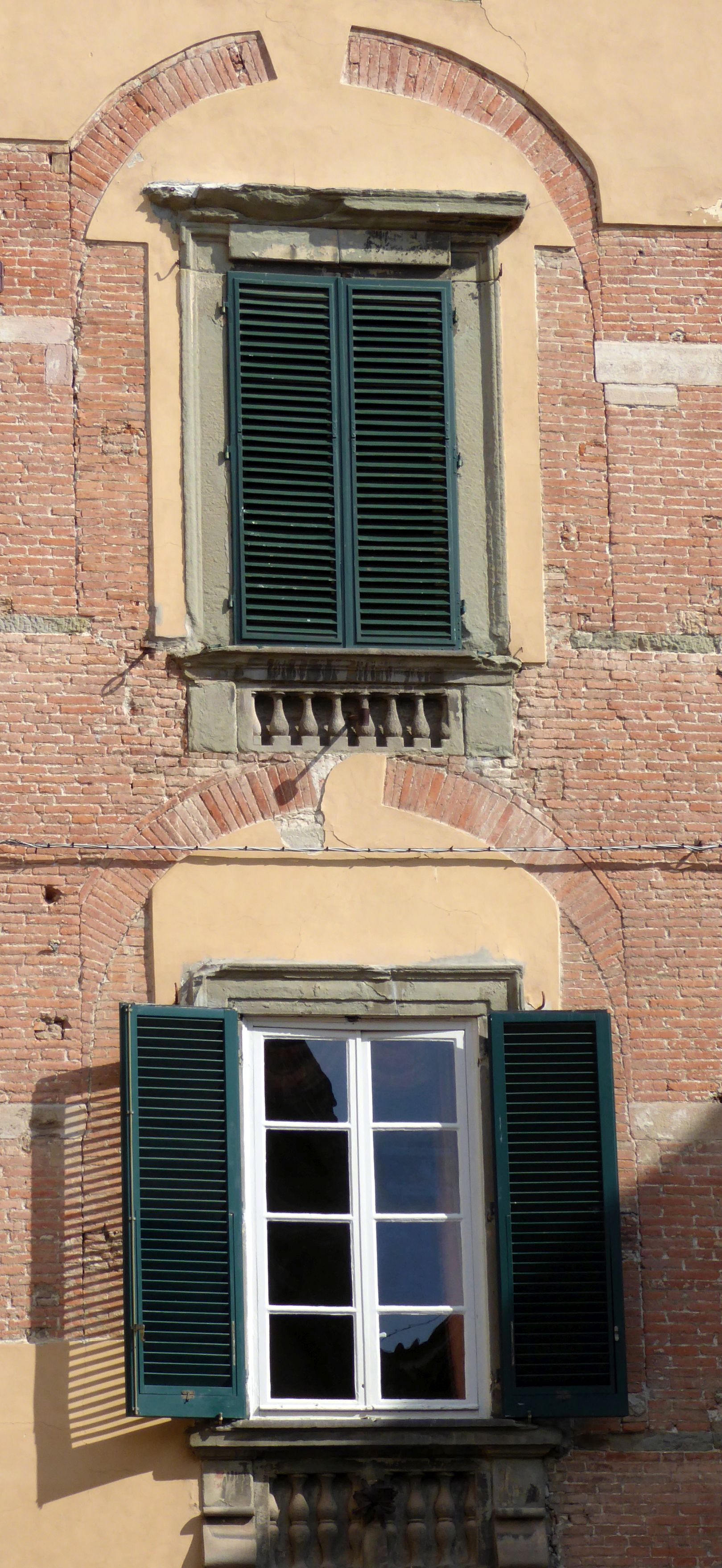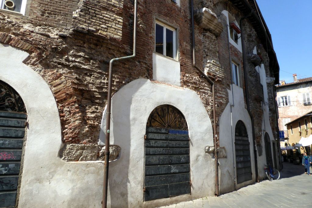As we continued our walk, we noticed that many of the buildings had plaster facades with some exposed brick showing, much like we saw in Bologna and Parma. Originally, the buildings of historic Lucca were made of brick; however, they have been covered with plaster and painted with warm colors as a way to unify and brighten the town.