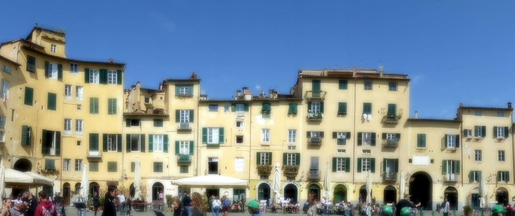 Piazza Dell’ Anfiteatro:This photo is a big fuzzy due to the panorama mode malfunctioning on my camera, but I wanted to give you an idea of the piazza’s charm.This is a picture I took when I visited Lucca in 2007. It was in the morning before the square got busy with tourists and the local lunch crowd.