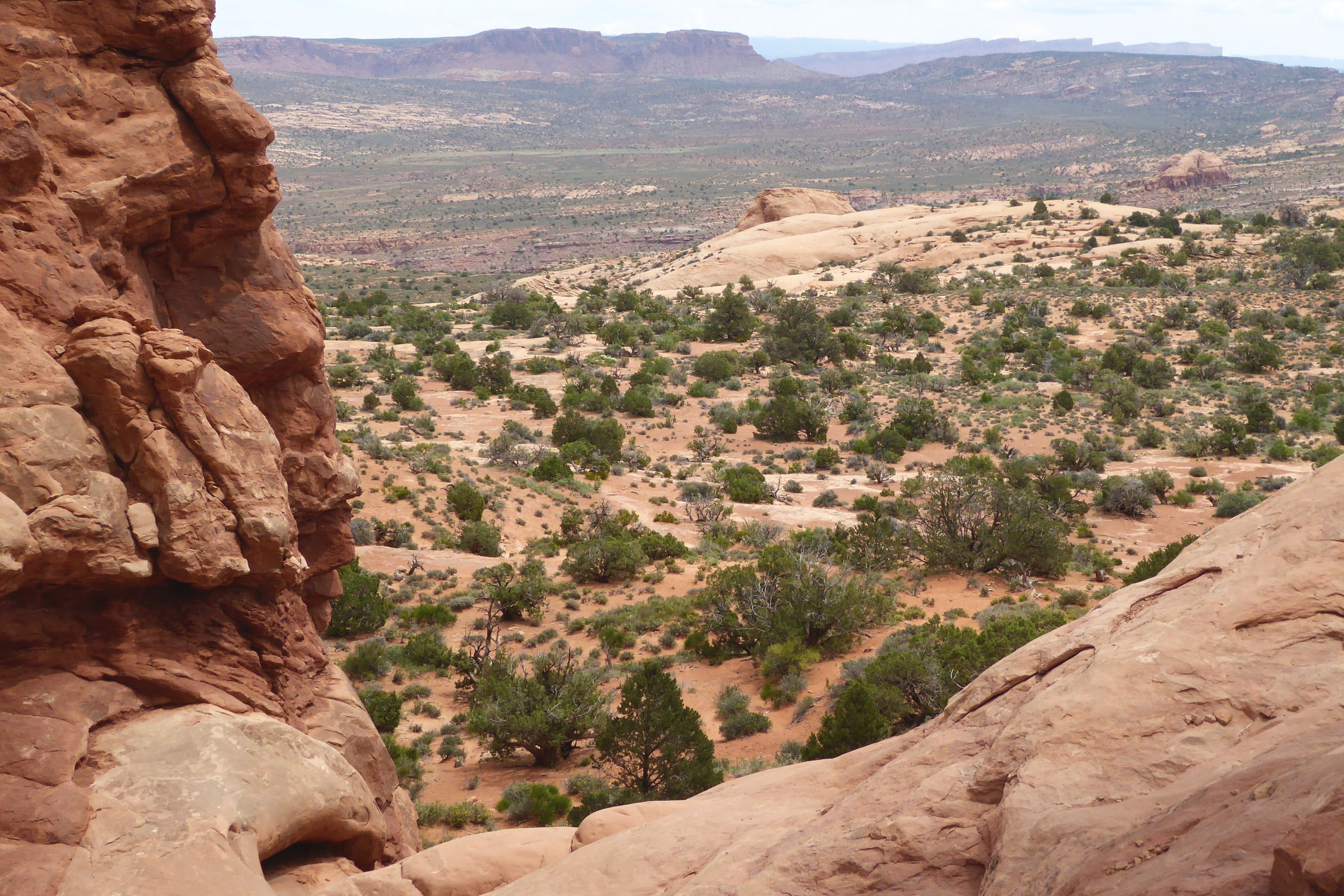On a clear day, the visibility from the viewpoint can reach nearly 100 miles. It was hazy off in the distance, but we could see snow on the mountain tops. There were also a couple of bright blue pools that seemed completely out of place. They were solar evaporation ponds for a mine owned by Intrepid Potash, Inc. Potash is potassium chloride, a salt found in the Paradox Formation. Salt deposited from ancient seas made up this formation as it evaporated and was buried by other sediments.