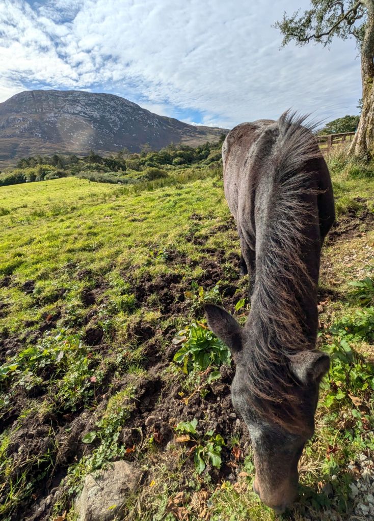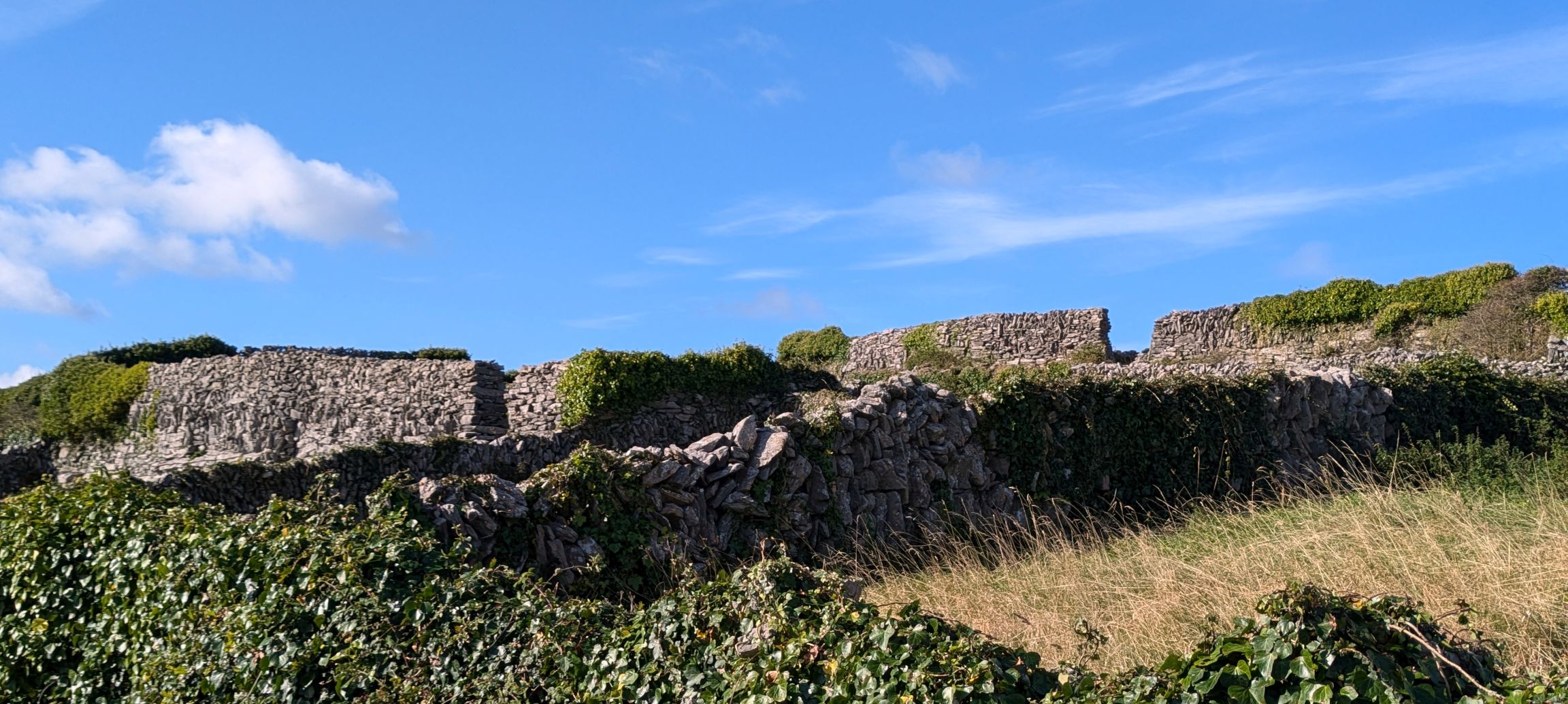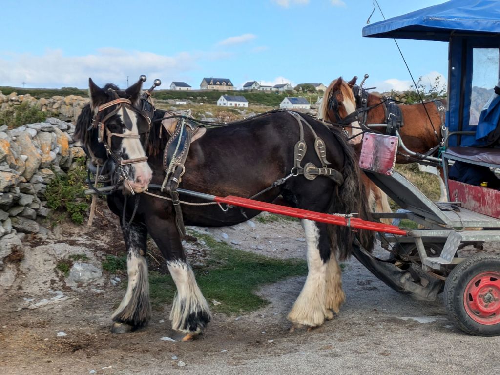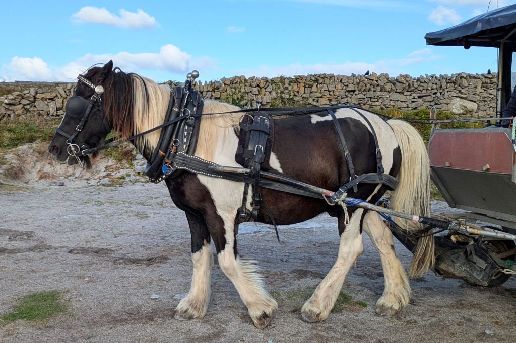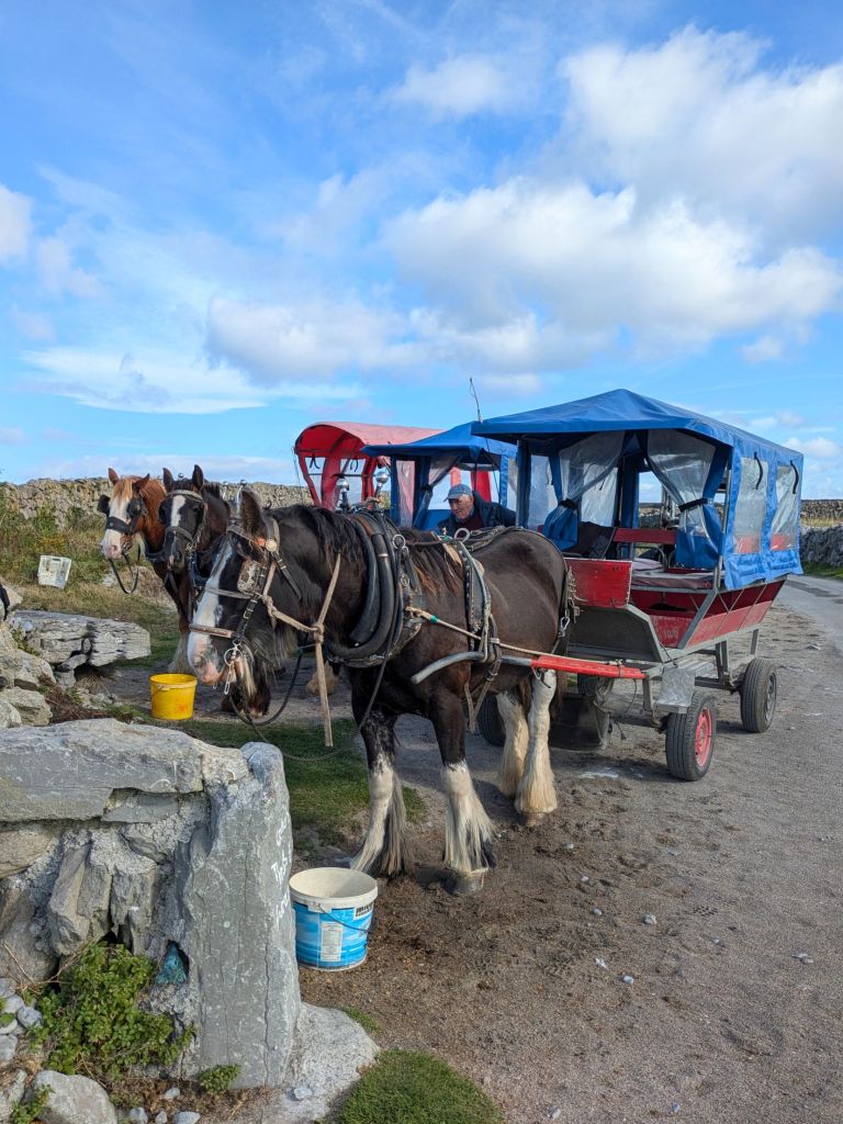 We toured the island by horse drawn wagon and learned about life on Inis Oirr. Early settlers had built dry stone walls to protect the soil for their crops, so we were able to see these walls across the landscape along with prehistoric stone forts that date back to 1100 BC. Other ruins we saw dated back to 1500 BC.