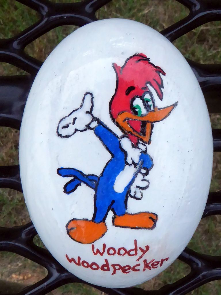 Woody Woodpecker is yet another bird to join the hummingbird, toucan, penguin, yellow bird of unknown species, yellow canary, duck, and owl that have all flown (or waddled) onto our Sun City Peachtree bench.