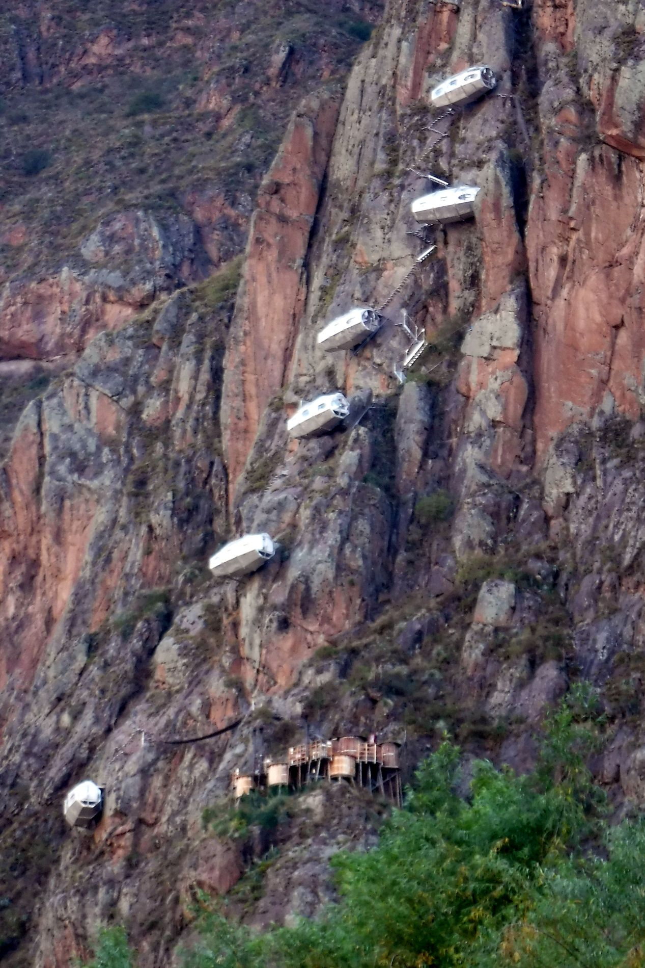 Those white structures hanging off the side of the mountain are hotel rooms for hikers!