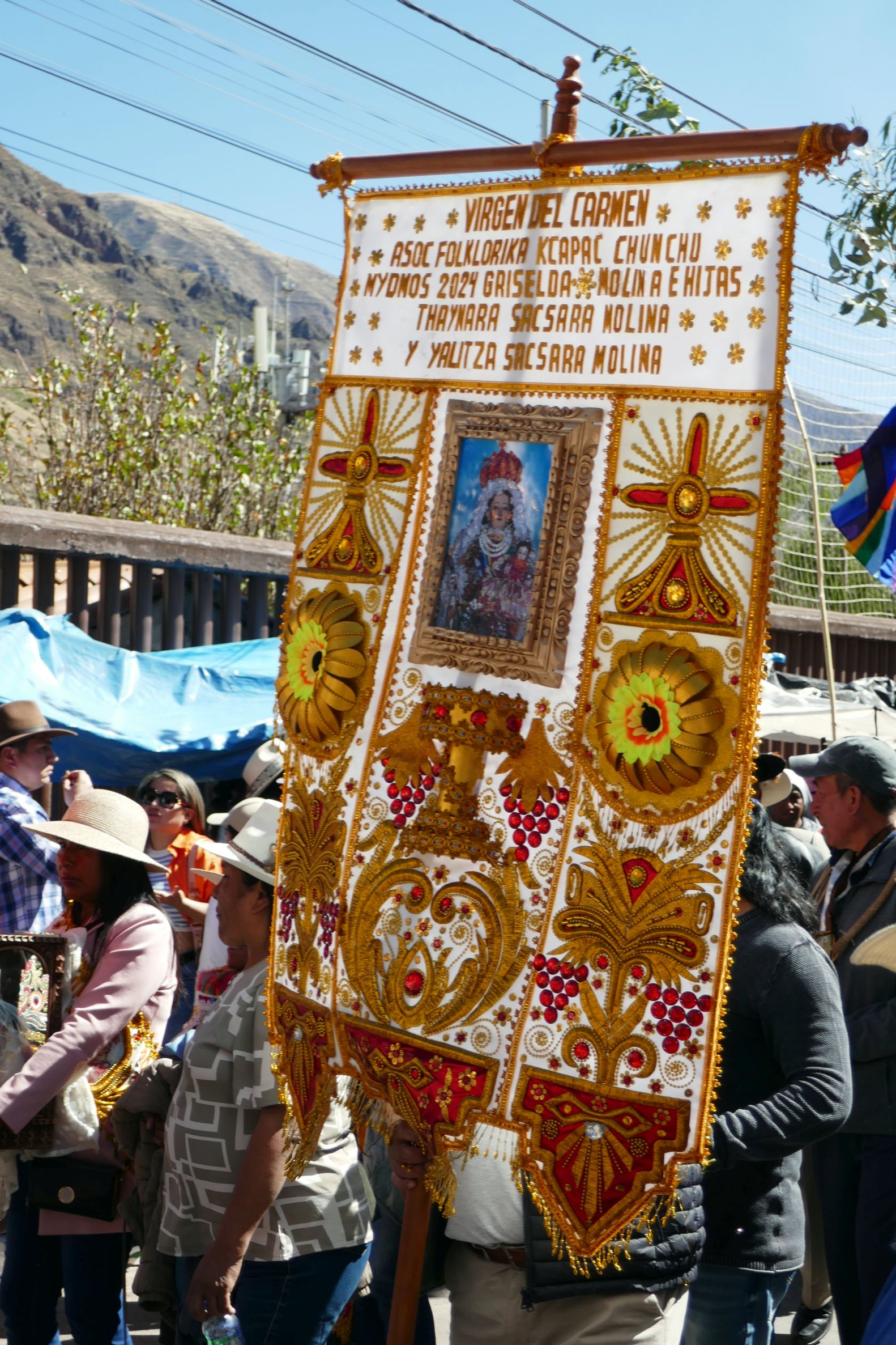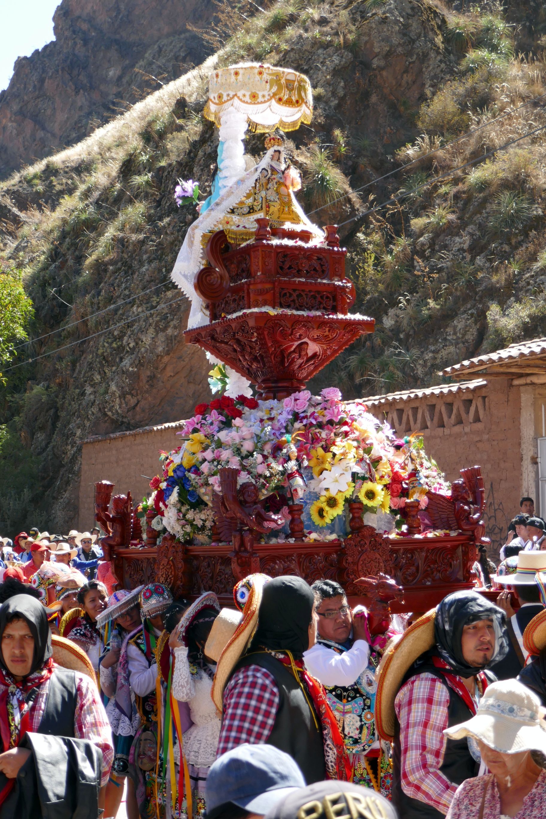 The parade and festival was celebrating Virgen del Carmen, an annual celebration that draws thousands of Peruvians and tourists to Pisac . Raul, of course, knew all about it, but he wanted to surprise us. He was hoping our timing would be right for the parade, and it was spot-on. Encouraging us to jump out of the bus and join in on the fun, I didn’t hesitate. I grabbed my camera and told Bruce I would meet him at the end of the route where the bus would catch up to us. It was too crowded and chaotic to stick together, and the bus wasn’t going anywhere until the parade concluded. So, if you can’t beat ‘em, join ‘em! And that we did!