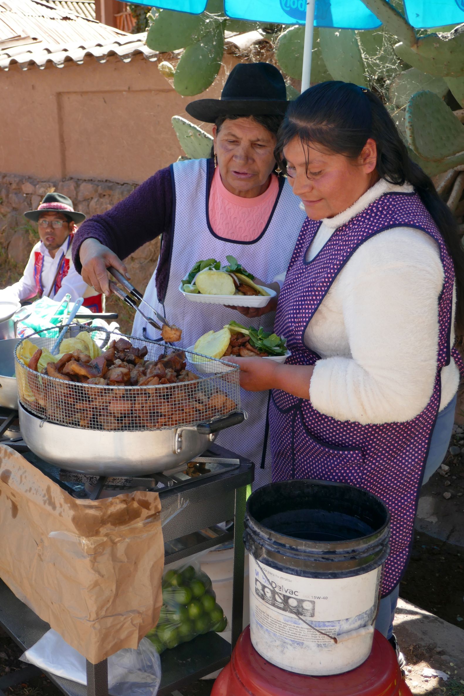 Lunch included tasty juice made from black corn, cinnamon, cloves, sugar and key lime. We also had squash soup, delicious vegetable filled tortillas, and guinea pig. Bruce and I gladly offered our shares of guinea pig to Raul. He loves the Peruvian delicacy; we preferred the tortillas and everything else.