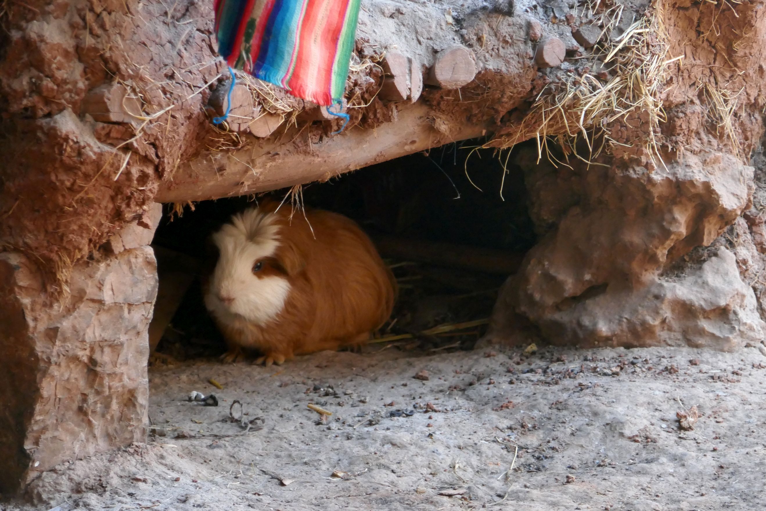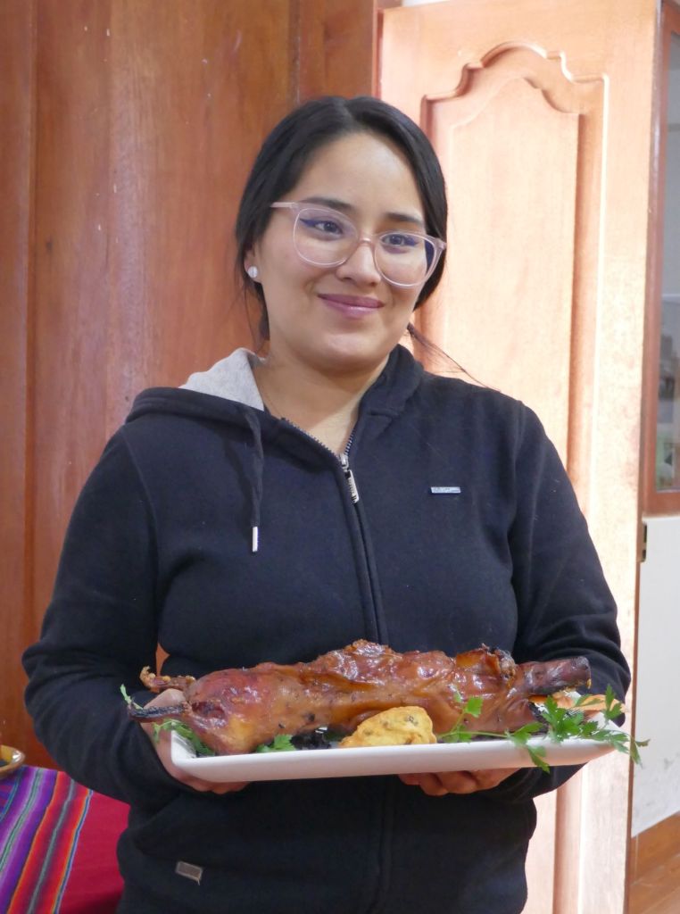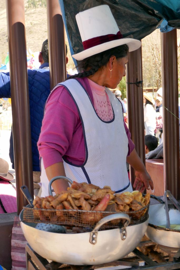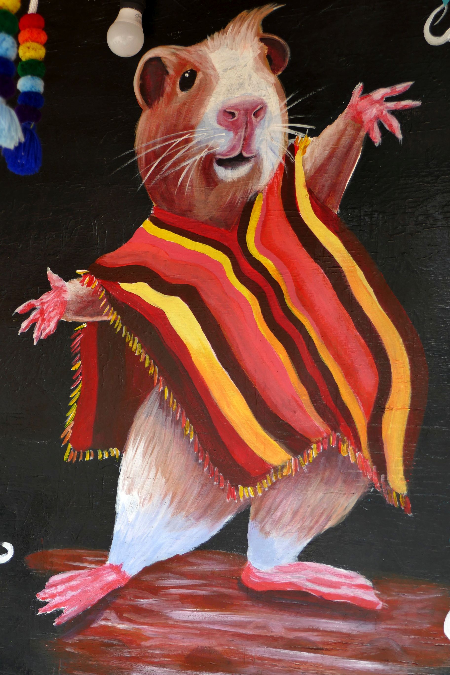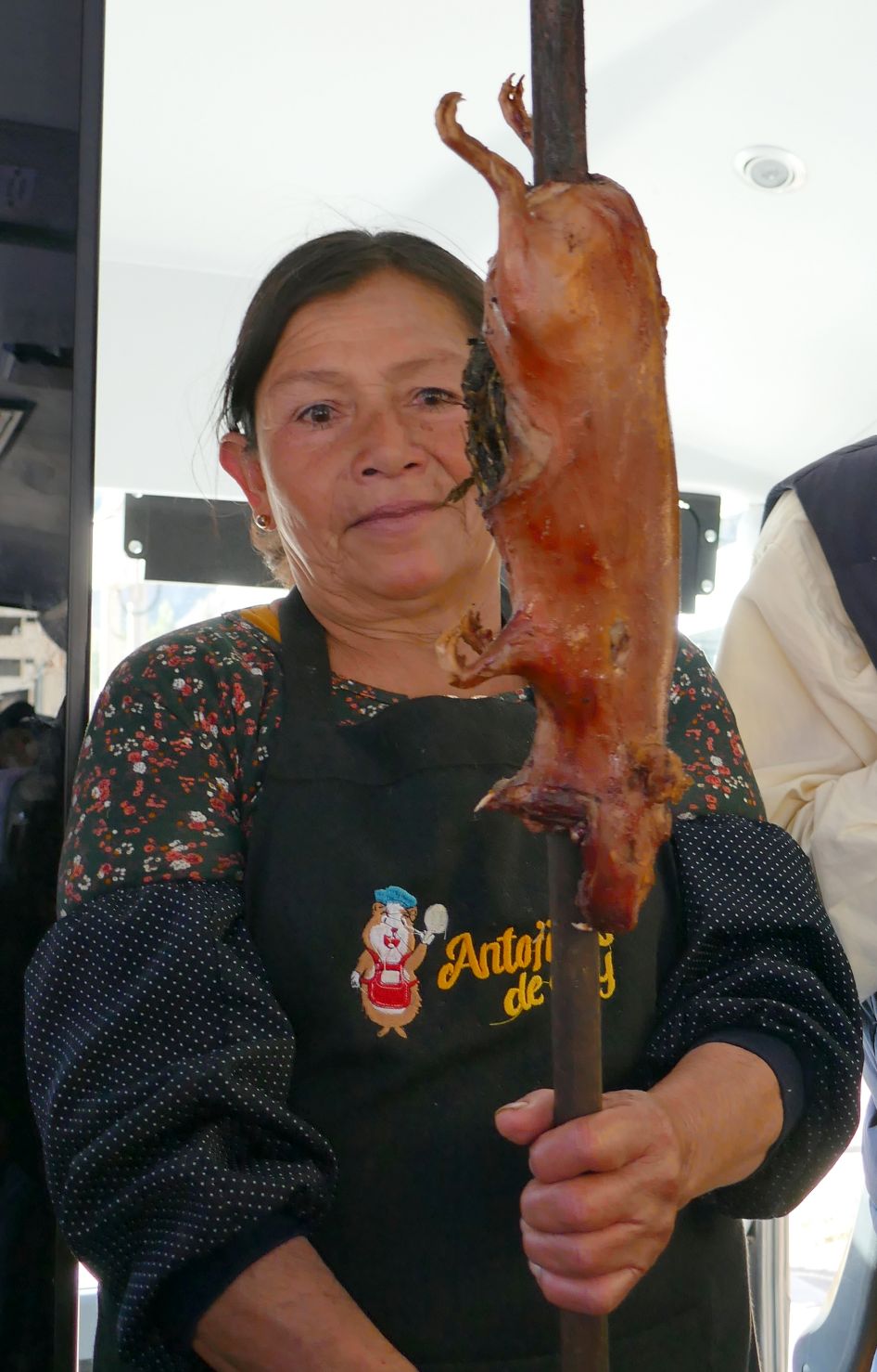 On the way to our hotel, Raul had the bus driver pull over and asked this woman selling roasted guinea pig if she would come aboard to show us. Guinea pig is a delicacy in Peru; however, I grew up with my sister’s pet guinea pigs…