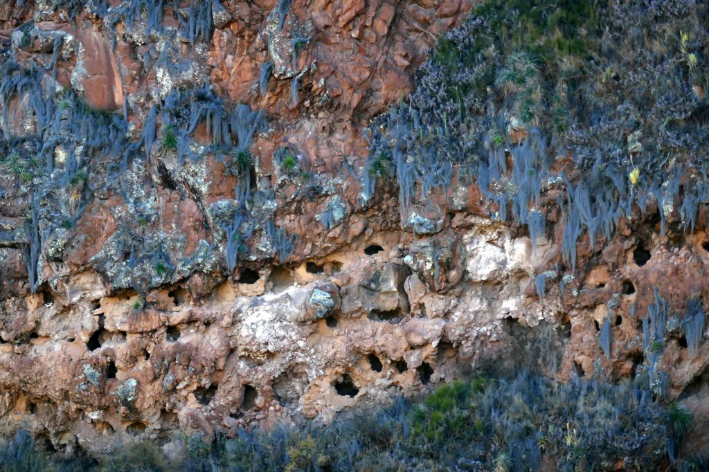 The purpose of the terraced complex was to keep an eye on and control the tribes who lived below. In the following picture, note the holes in the hillside. These holes were burial sites where the dead were buried in a fetal position: