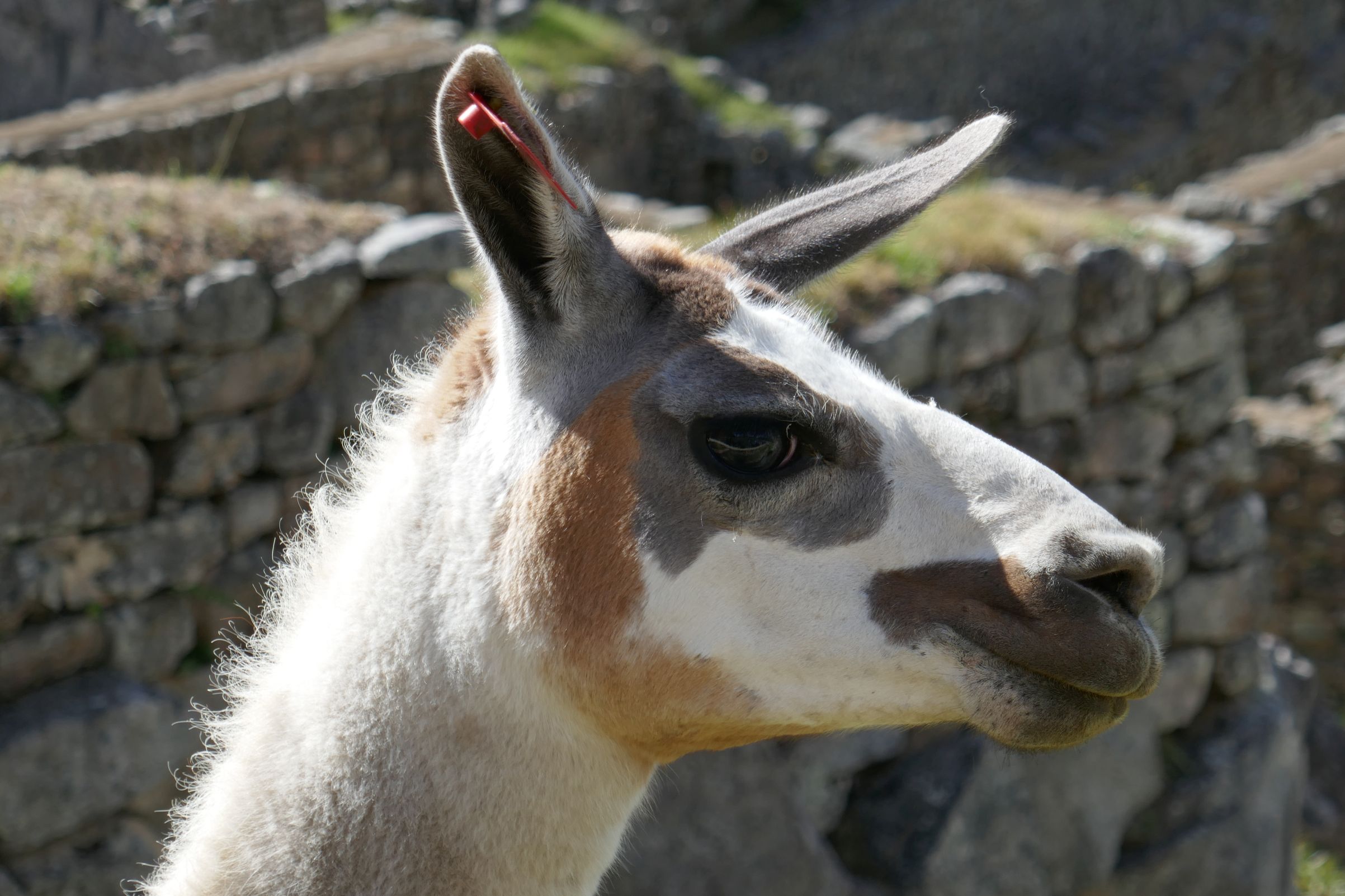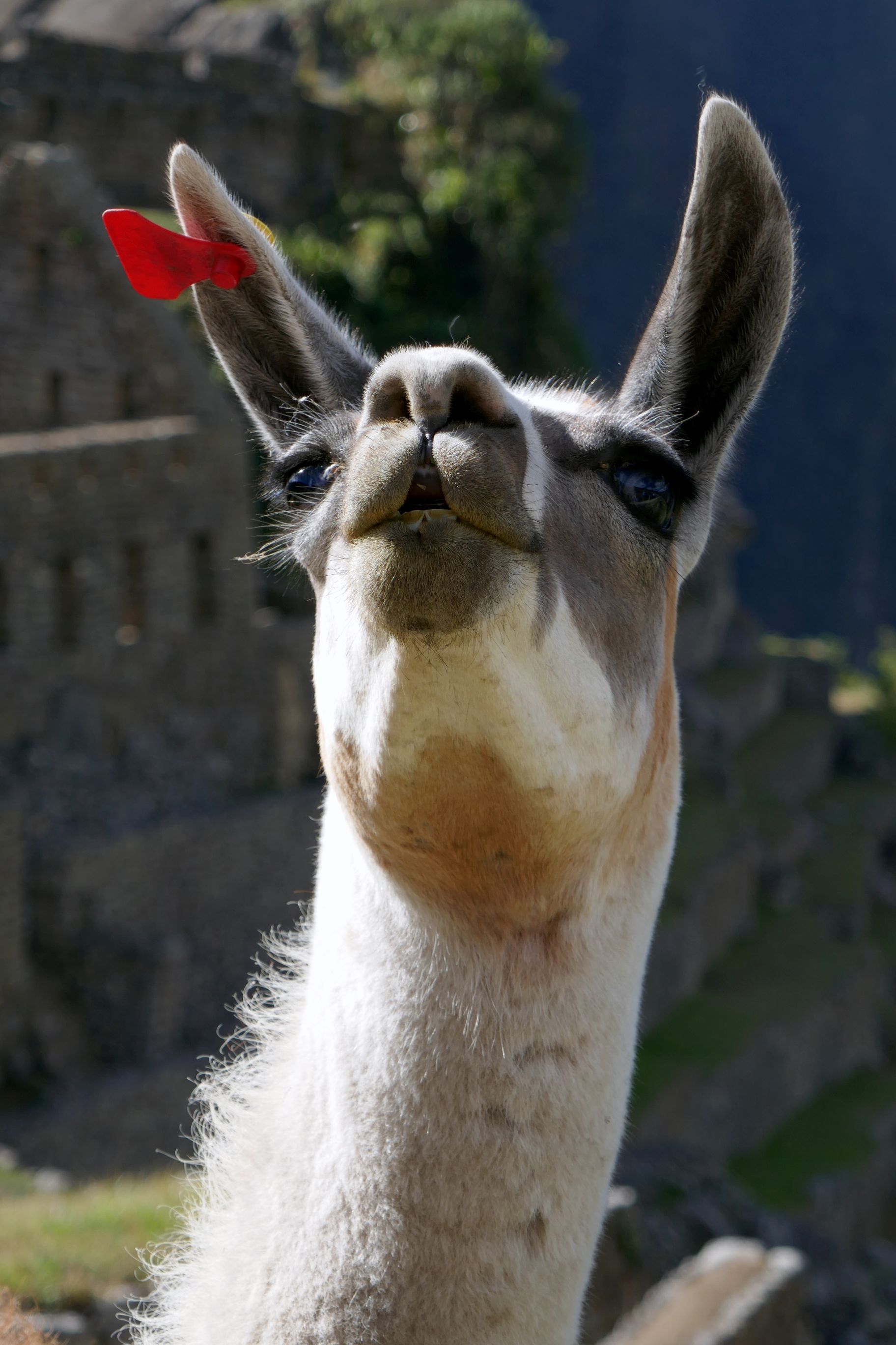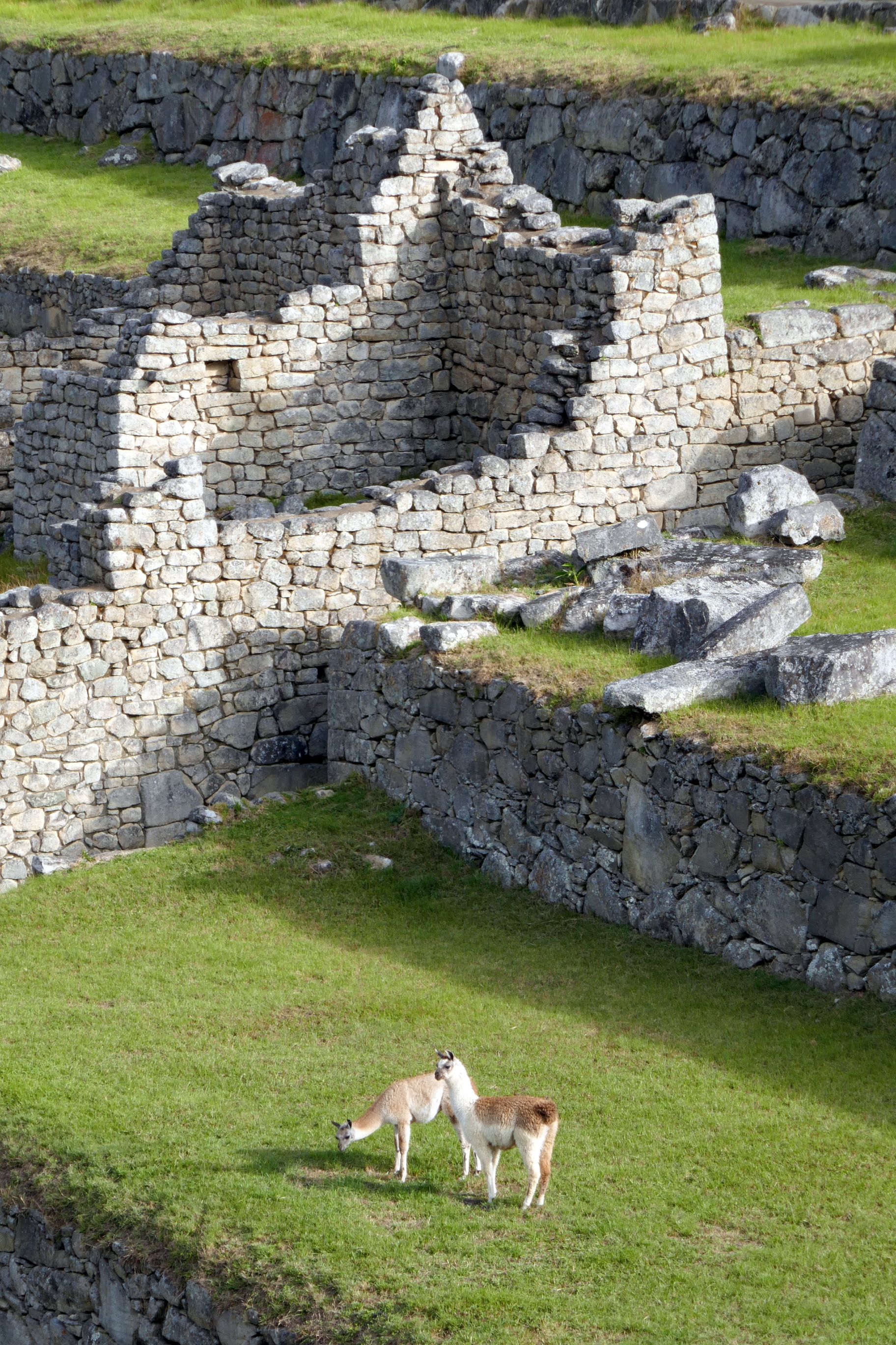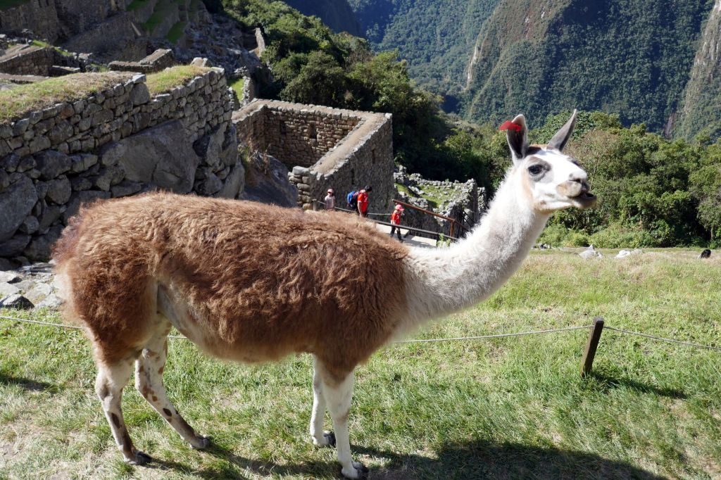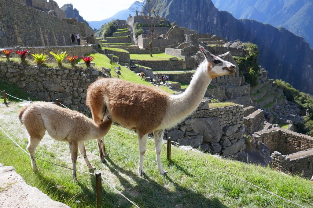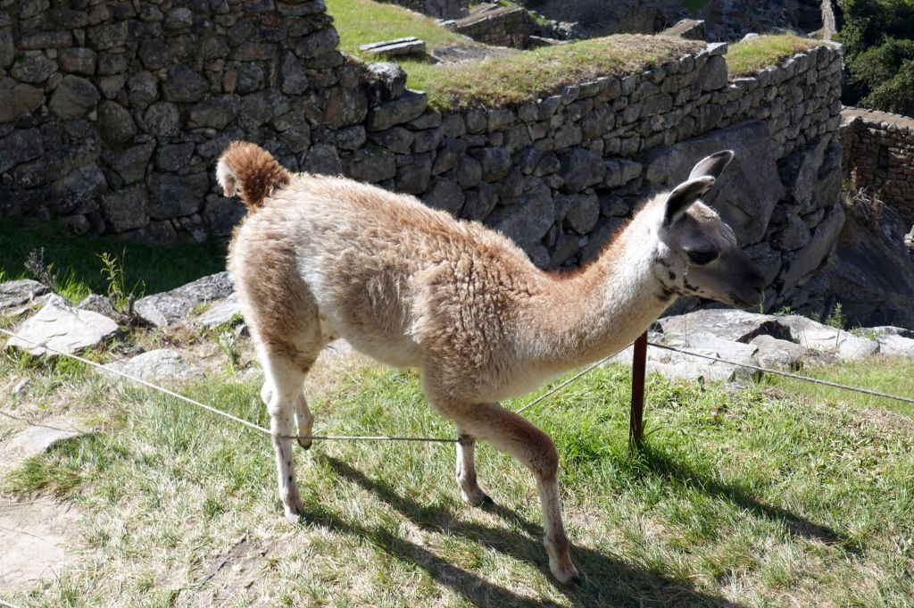 Our research also revealed that we may see an alpaca at Machu Picchu. As Raul stopped in a roped off area to share some of his vast knowledge of the Incas with us, this gal and her baby waited patiently for him to move, so they could walk past him to graze on the grass. They finally gave up and walked behind him, giving us all a good laugh while Raul was oblivious!