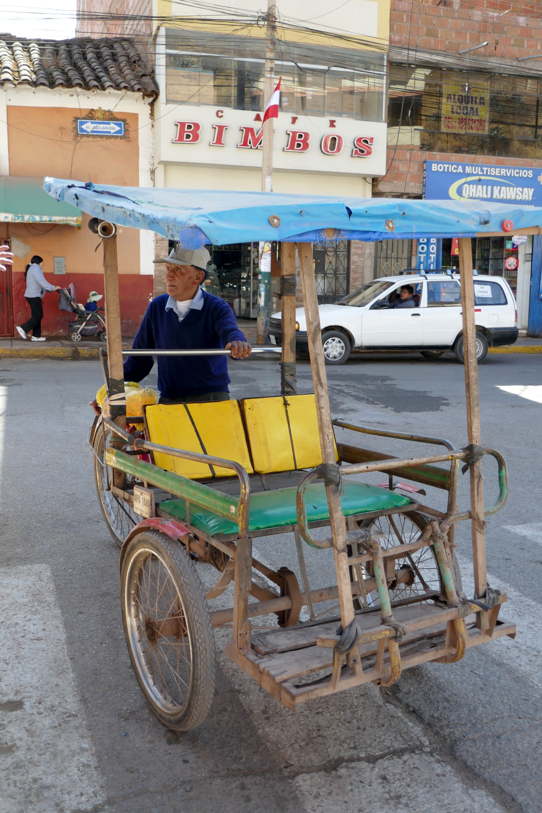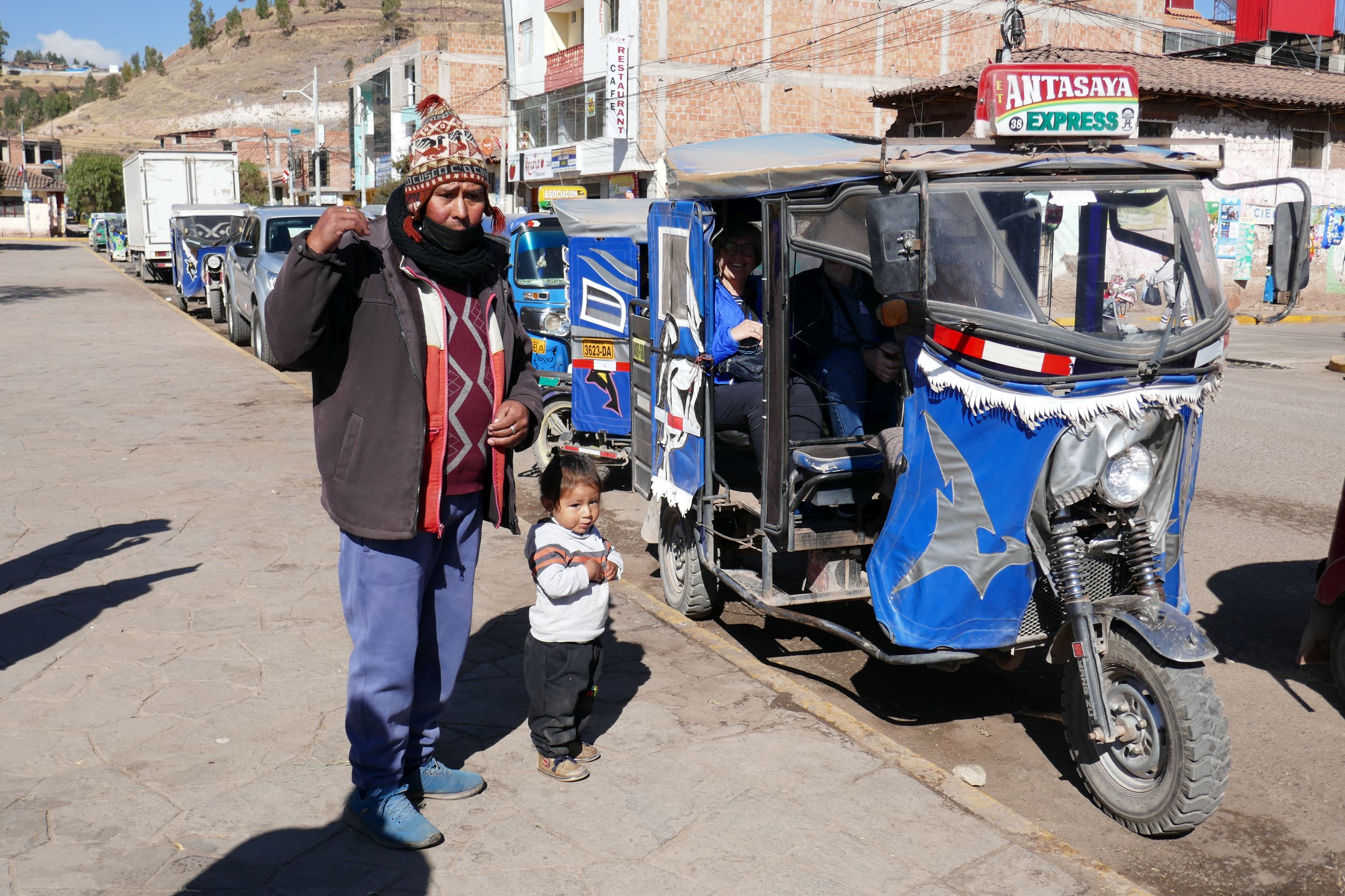 It was a day full of cultural discoveries, beginning with a visit to Izcuchaca (elevation 11,000 feet), a village in the Anta Province of Cusco. The popular and most cost-effective mode of transportation in Peruvian villages is by moto taxi, so we did what the locals do. Our bus dropped us off in town, and Raul hailed several moto taxis for our group of 16 to take us to the local mercado (market). These three-wheeled covered motorcycles are cheaper than a car taxi—about 25 cents a ride. Want to buy one of these three-wheelers? A new one will set you back about $2,600.
