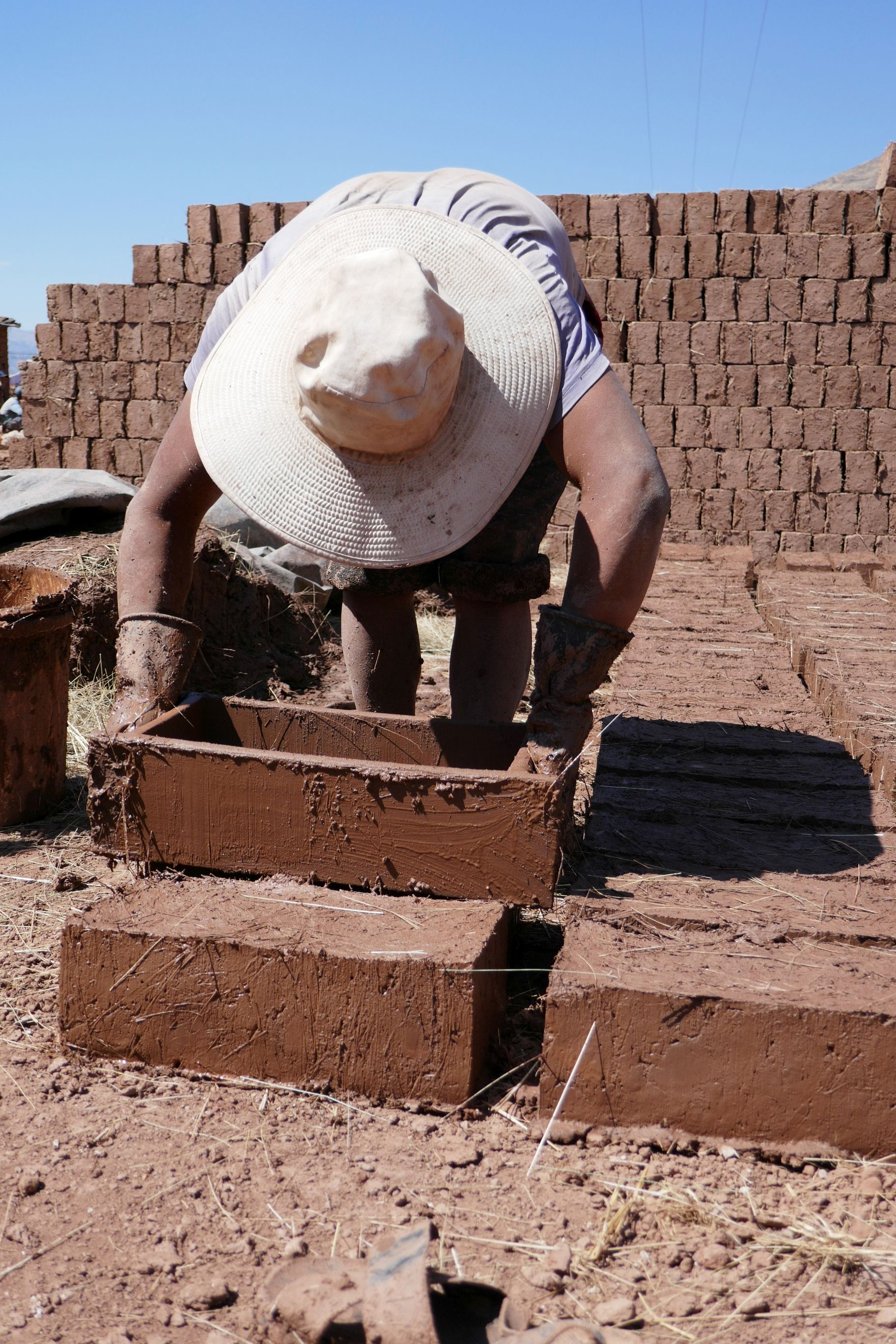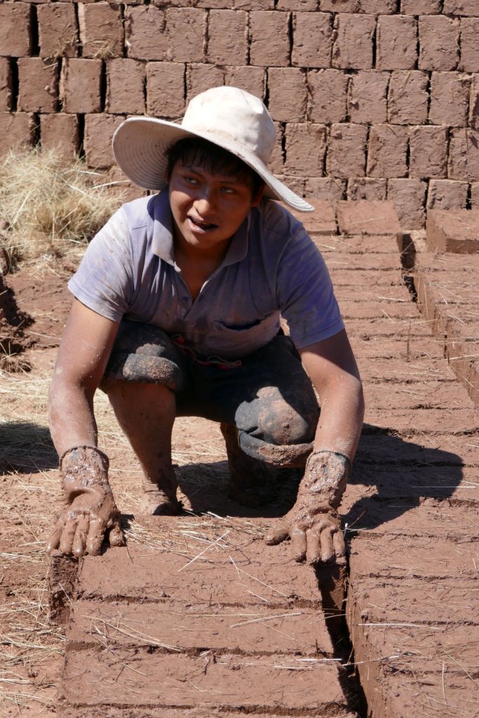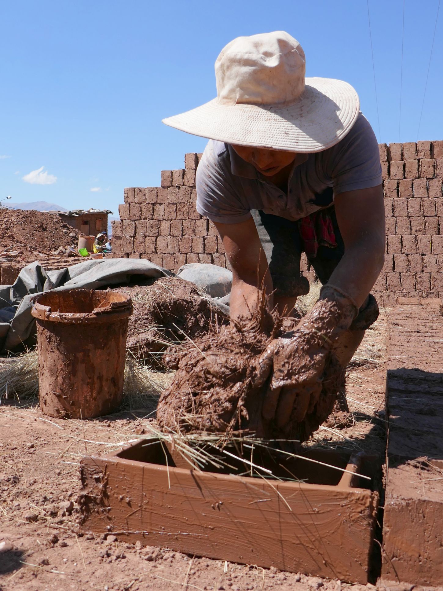 The man explained to Raul that straw is mixed in with the adobe mud for stability and strength. Time is money, so the more he works without a break, the better. To keep from getting hungry and thirsty while making the bricks, he chews on coca leaves, common with Peruvian laborers.